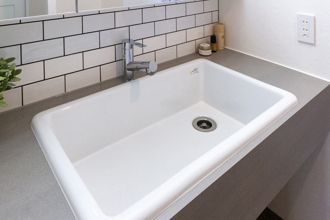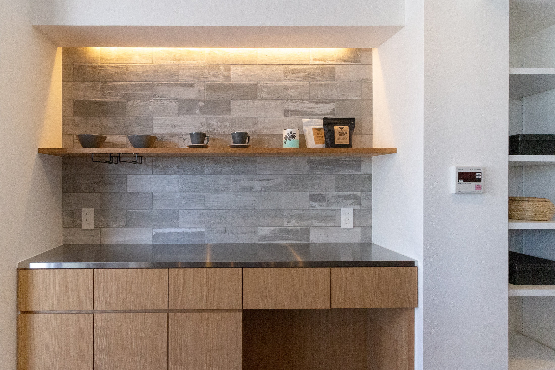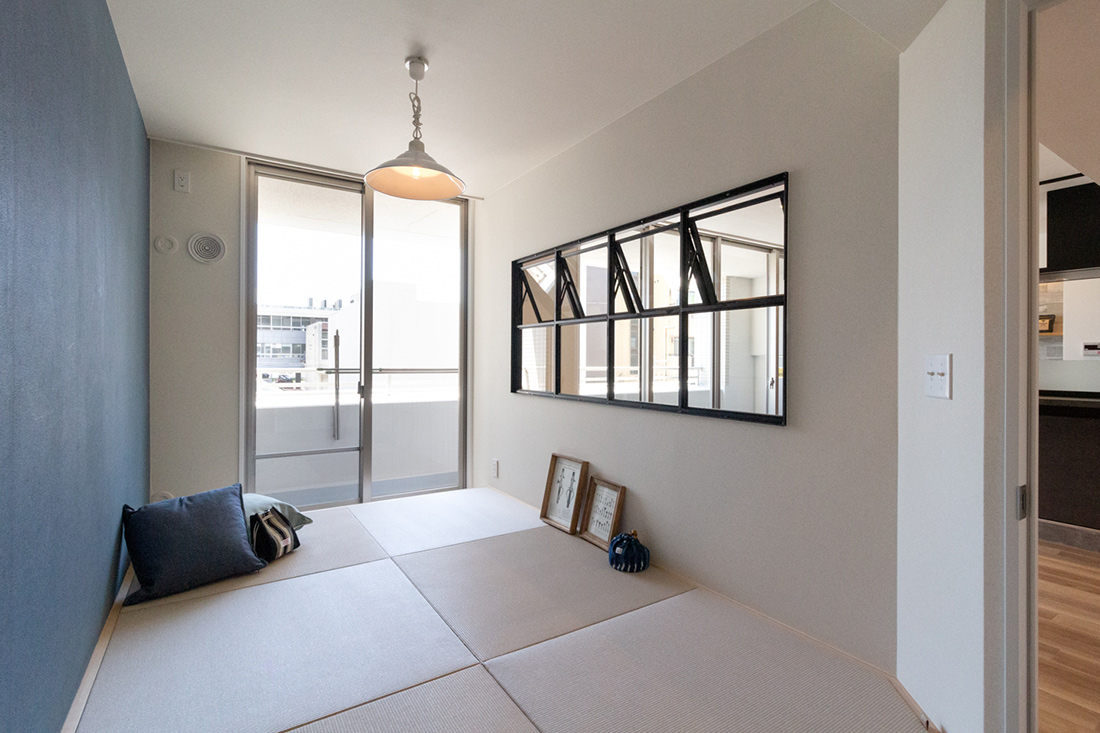 大阪府堺市、築19年の中古マンションリノベーション。タイルと照明がアクセントとなりシンプルながら個性あるリビング。一段上がったアイランド型キッチンの空間には、ステンレスの天板を使用したオリジナルのカップボードと、美しいタイルの飾り棚を。天井からの間接照明が棚に飾った器を照らし高級感を演出。 アーチ開口の曲線デザインが目を引くパントリーは冷蔵庫のスペースも設けた広さある収納空間で、キッチンをよりスッキリと見せることができます。アイアンの室内窓からLDKを見渡すことのできる和室は小上がりのデザインと畳下収納がポイント。ウォッシュルームは清潔感ある白のタイルとヘキサゴンデザインの床、モルタルでモノトーンにまとめ、落ち着いた雰囲気に。キッチン、リビング、ウォッシュルームまで様々なタイルと素材でメリハリあるリノベーション空間となりました。