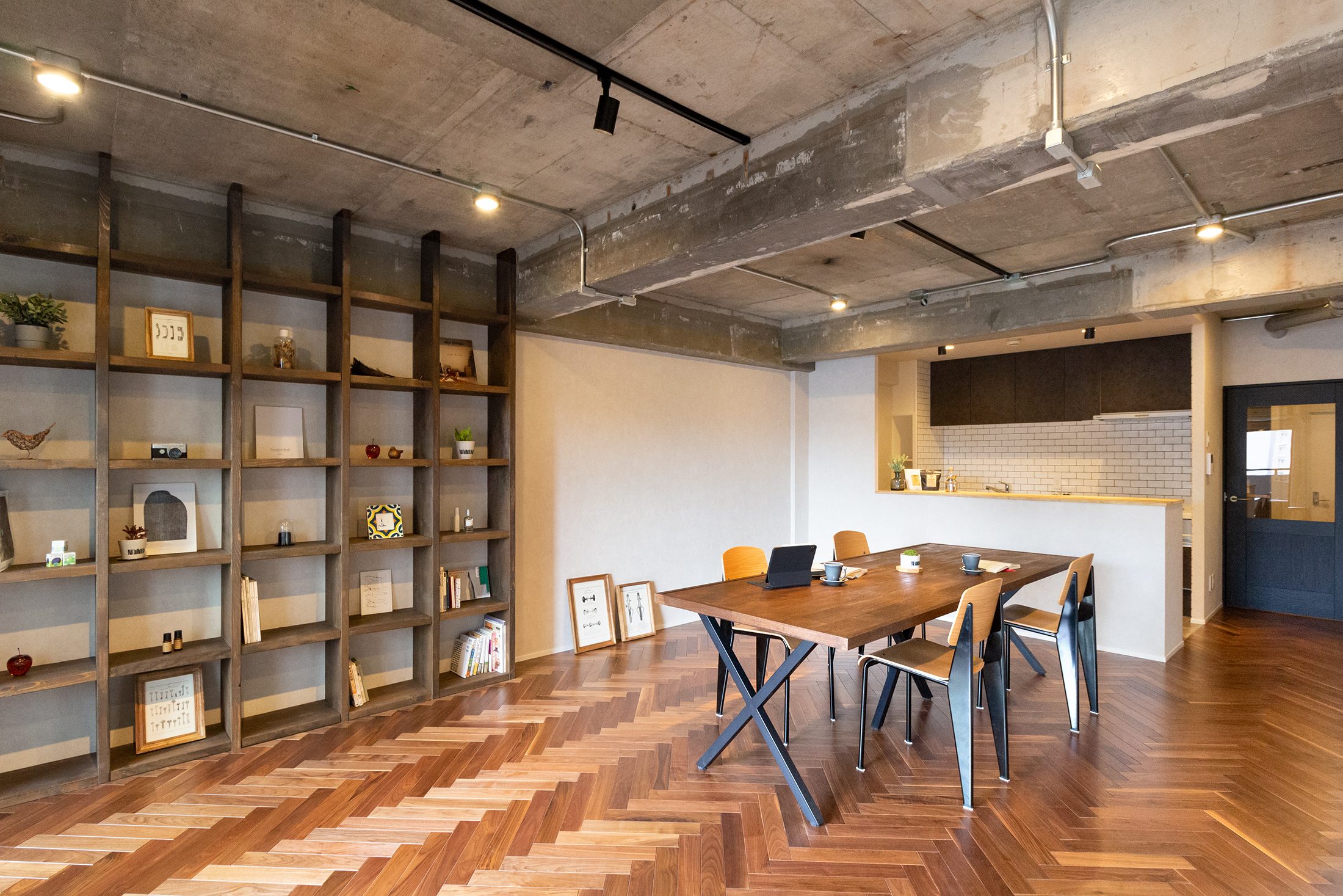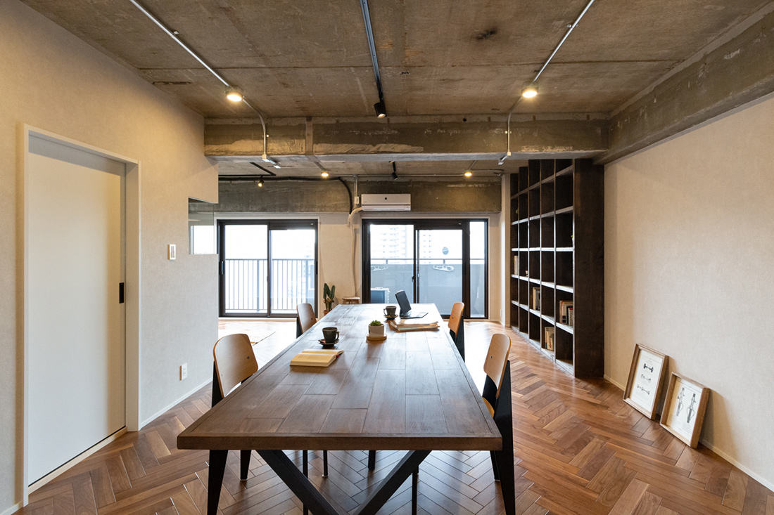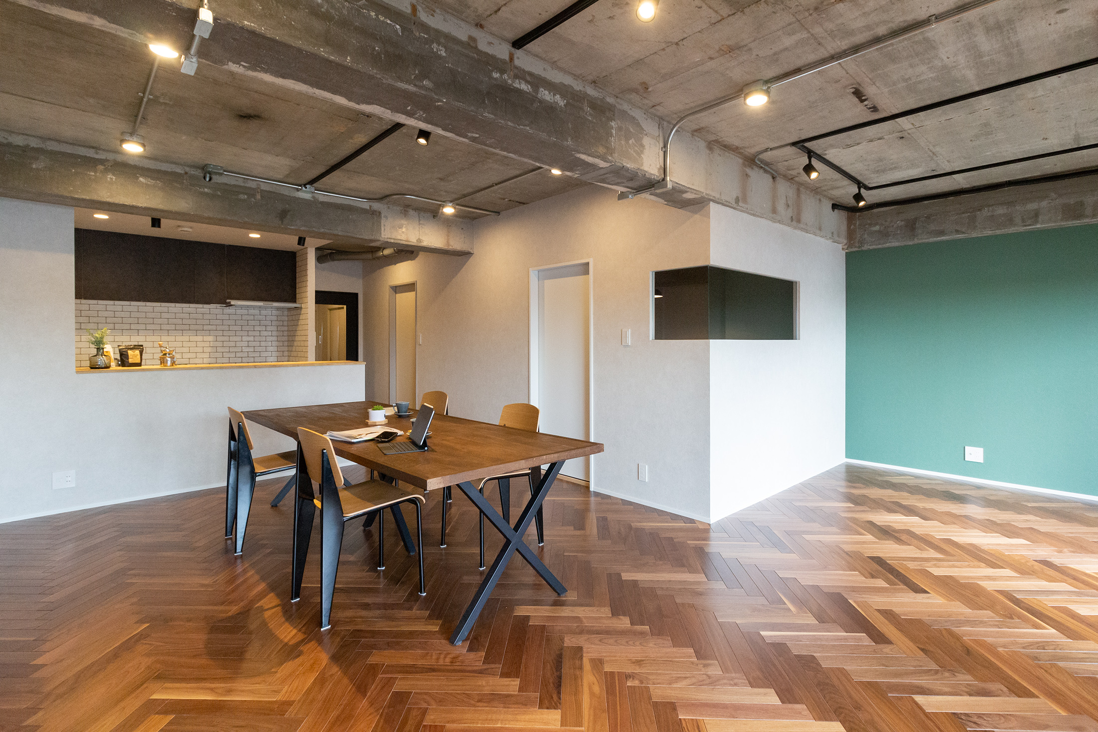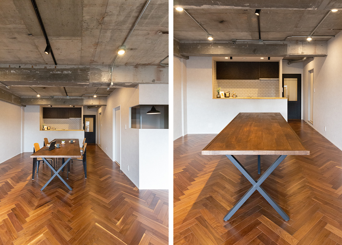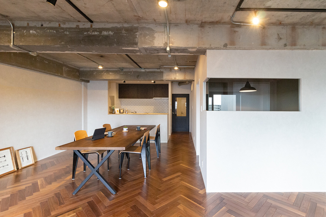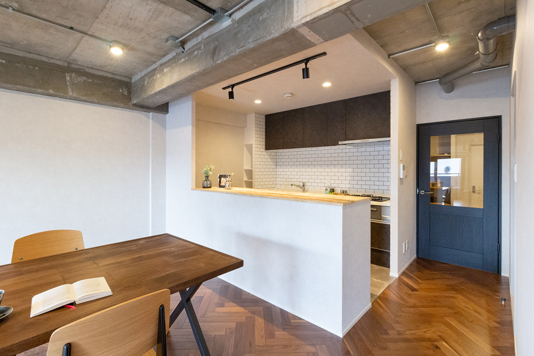 大阪府吹田市、築39年の中古マンションリノベーション。躯体現しの天井、ヘリンボーンがホールからLDKまで続く重厚感と落ち着いた照明で大人らしく。和室の壁の位置を変え、洗面ルームの壁と一直線にすることでホールからの見通しの良さと開放感を持たせました。メインのLDK空間には、ダークカラーのヘリンボーンにマッチするようにStandardオリジナルデザインのダイニングテーブルと壁面シェルフを。キッチンカウンターのラフ木材の天板もこだわりポイント。広い天井と床、ウッドを基調とする落ち着いた色味に、ドアのネイビーカラーとグリーンのアクセントクロスが空間を引き締めます。和室の壁にはバルコニーからの光を取り込む、L字ガラスの室内窓を設置。空間から家具まで、トータルで仕上げたリノベーション空間となりました。