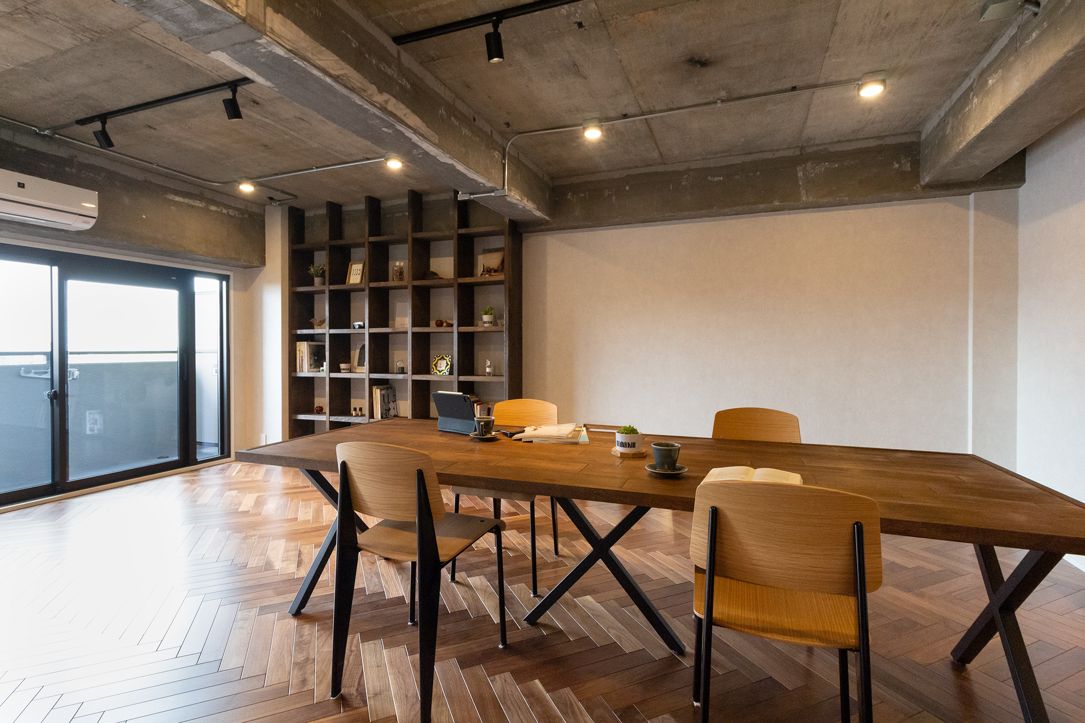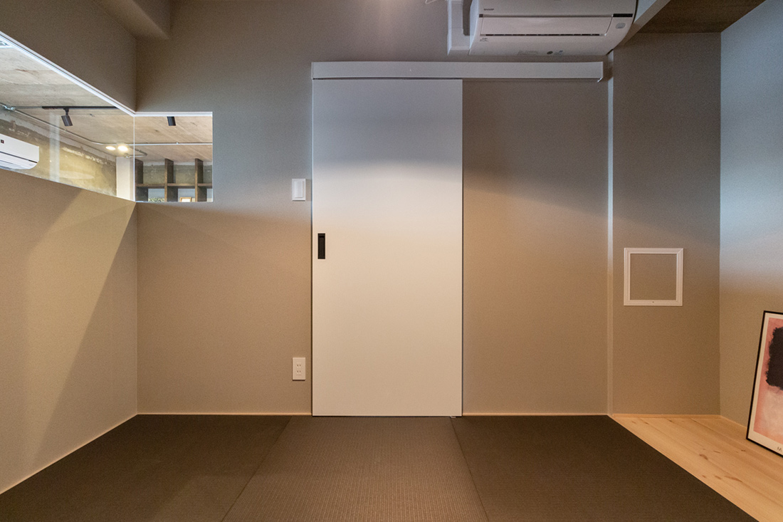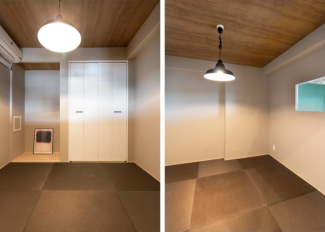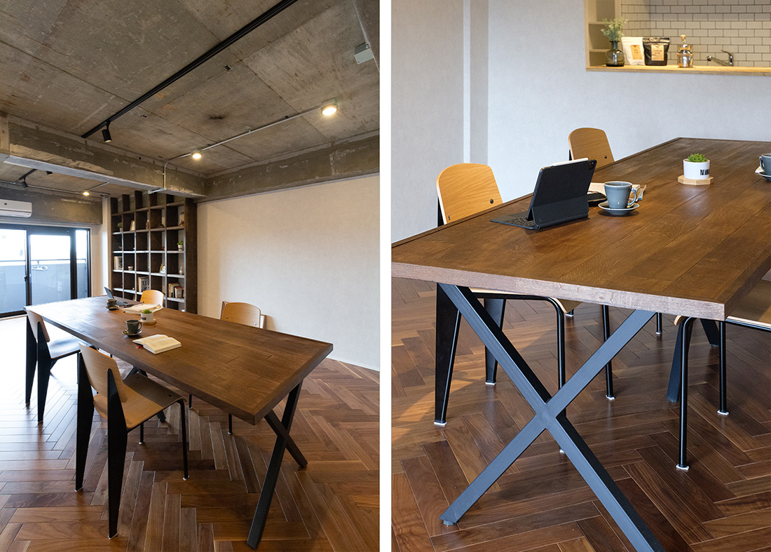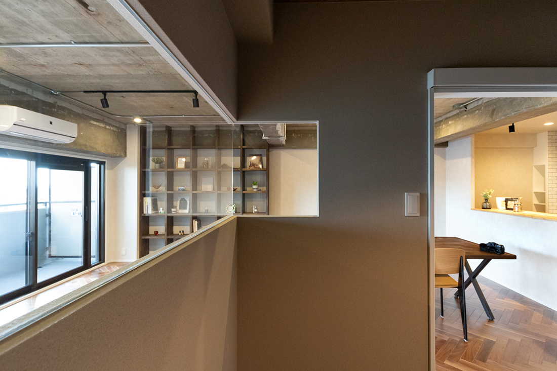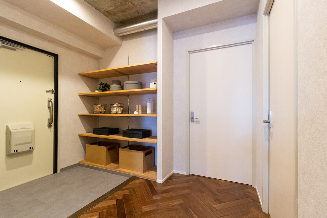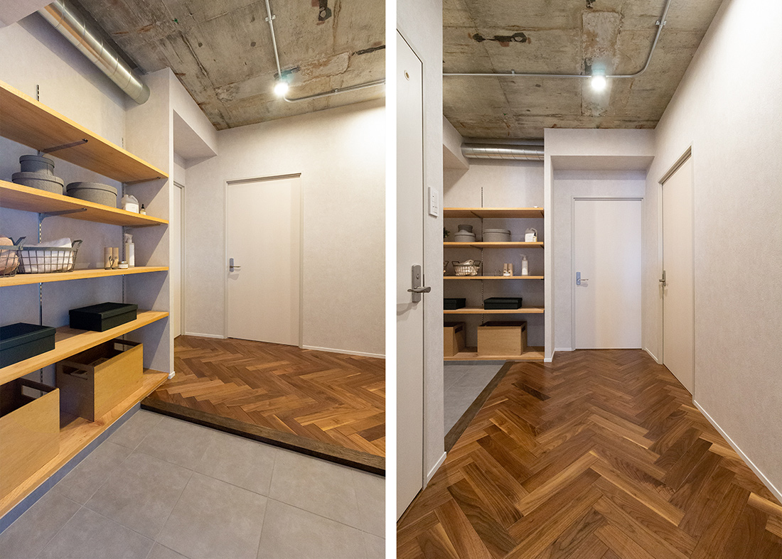 大阪府吹田市、築39年の中古マンションリノベーション。躯体現しの天井、ヘリンボーンがホールからLDKまで続く重厚感と落ち着いた照明で大人らしく。和室の壁の位置を変え、洗面ルームの壁と一直線にすることでホールからの見通しの良さと開放感を持たせました。メインのLDK空間には、ダークカラーのヘリンボーンにマッチするようにStandardオリジナルデザインのダイニングテーブルと壁面シェルフを。キッチンカウンターのラフ木材の天板もこだわりポイント。広い天井と床、ウッドを基調とする落ち着いた色味に、ドアのネイビーカラーとグリーンのアクセントクロスが空間を引き締めます。和室の壁にはバルコニーからの光を取り込む、L字ガラスの室内窓を設置。空間から家具まで、トータルで仕上げたリノベーション空間となりました。