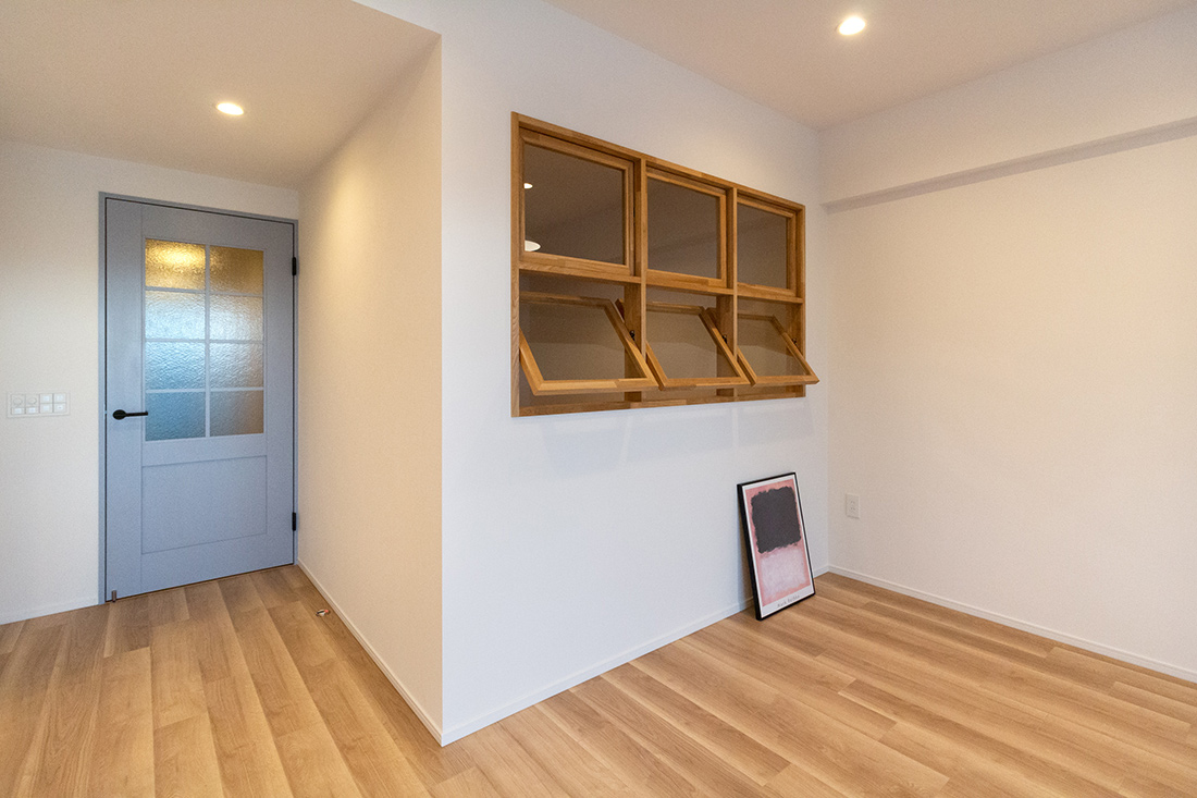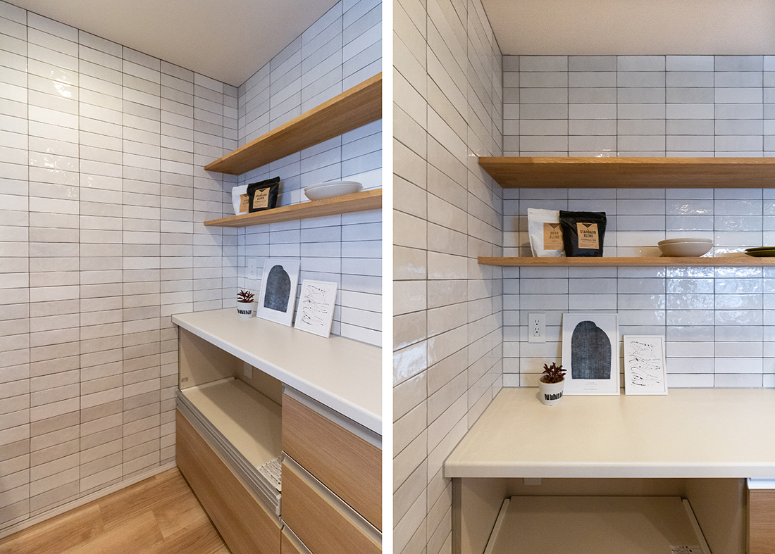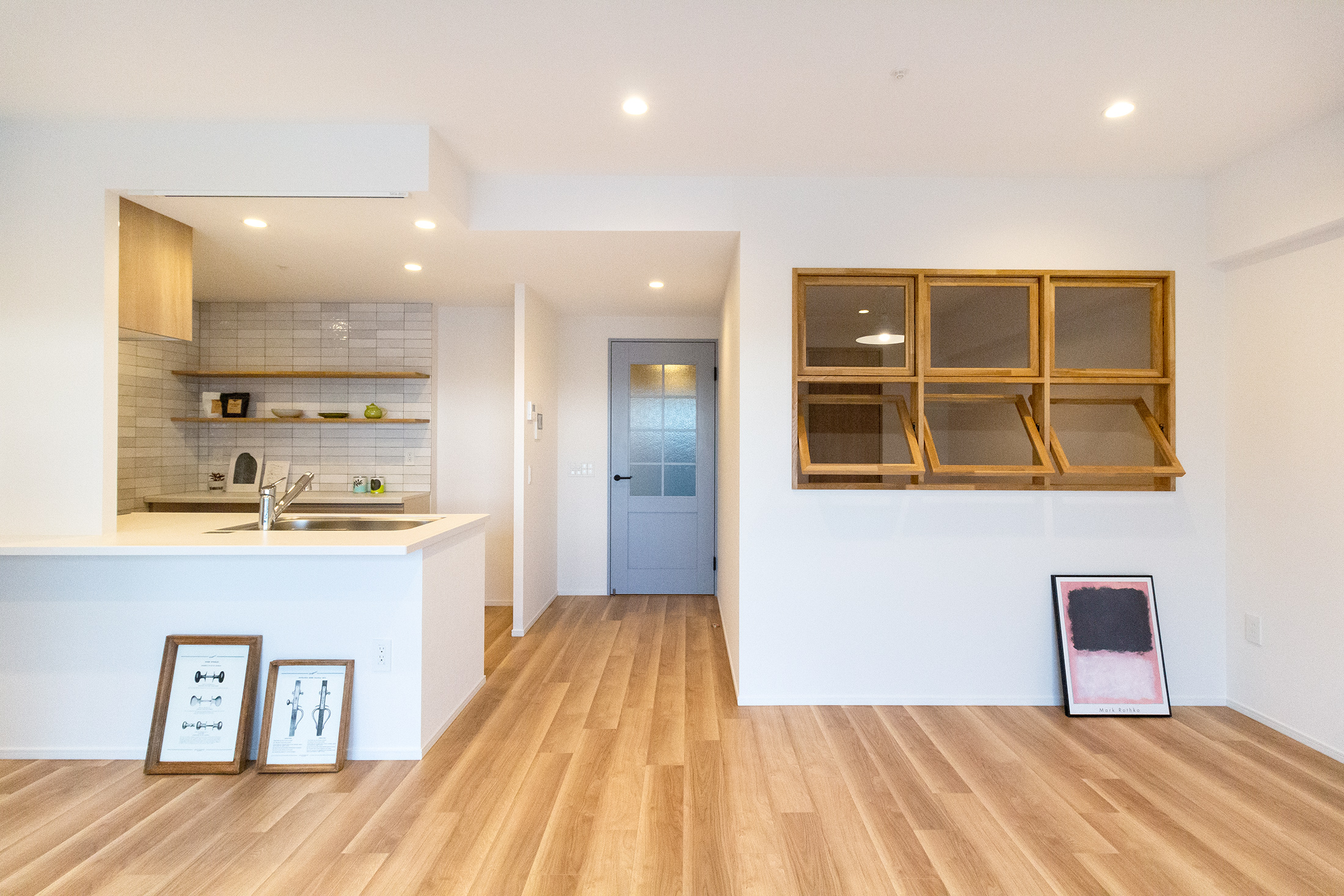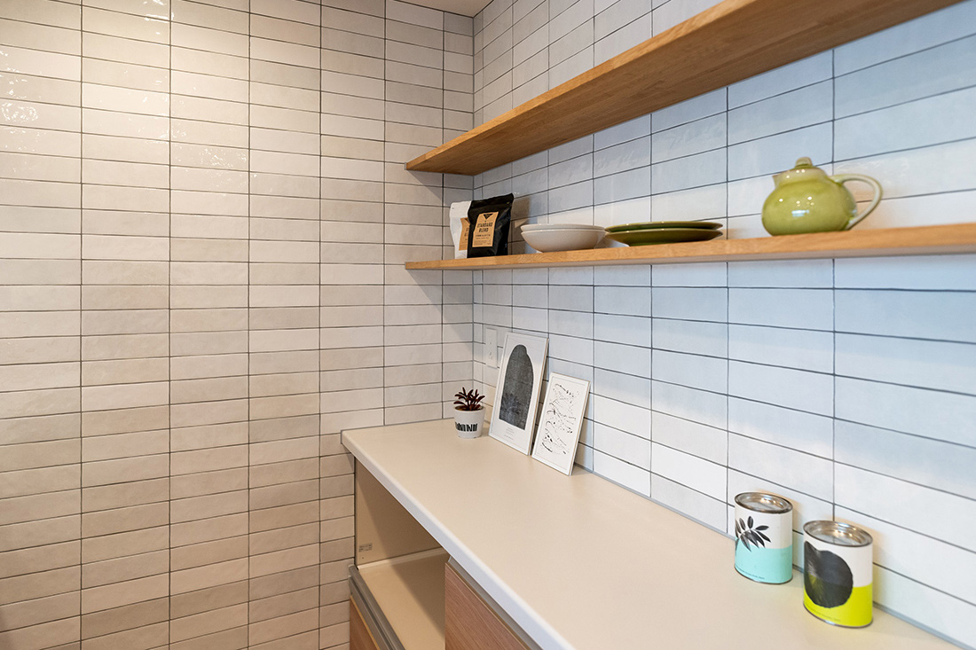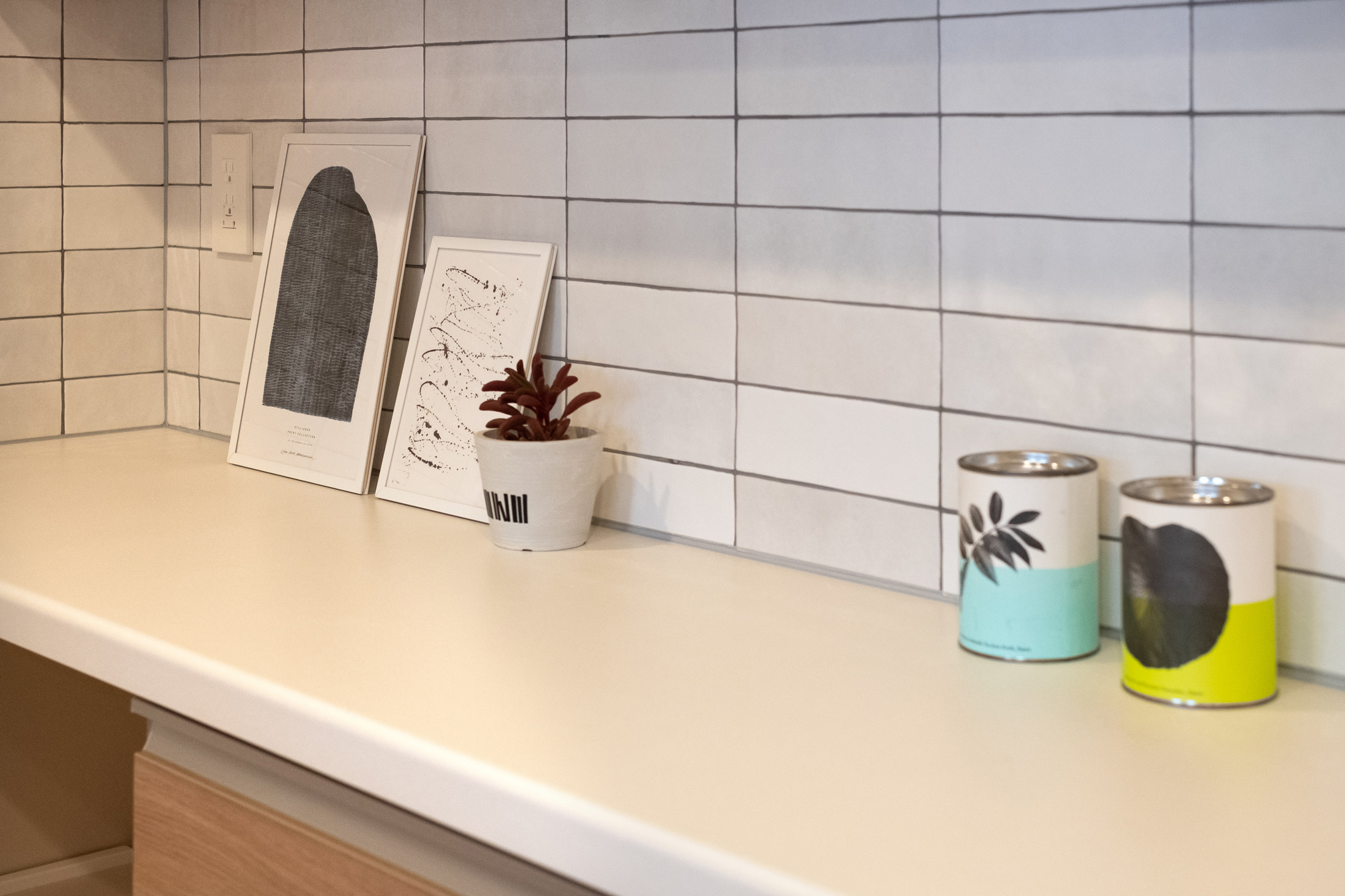 大阪府吹田市、新築マンションの部分リノベーション。キッチンの壁とカップボード背面には、トーンの異なるグレーがランダムに配置されたタイルを使用。タイルの上品さにマッチする落ち着いた色味のウッドシェルフを取り付けました。キッチンから目の届く位置にワークスペースを設けることで、家族がそれぞれの時間を過ごしていても存在を近くに感じることができます。使い勝手の良いワークスペース横のシェルフで本や作業ツールもすっきり収納。ブルーグレーのドアとウッドの室内回転窓がシンプルなリビング空間にあたたかみとアクセントをプラスします。ウォッシュルームは既存の洗面台や床のカラーにマッチしつつ存在感あるデザインタイルをチョイス。部分リノベーションながら、個性やこだわりを叶えた新築リノベーション空間となりました。