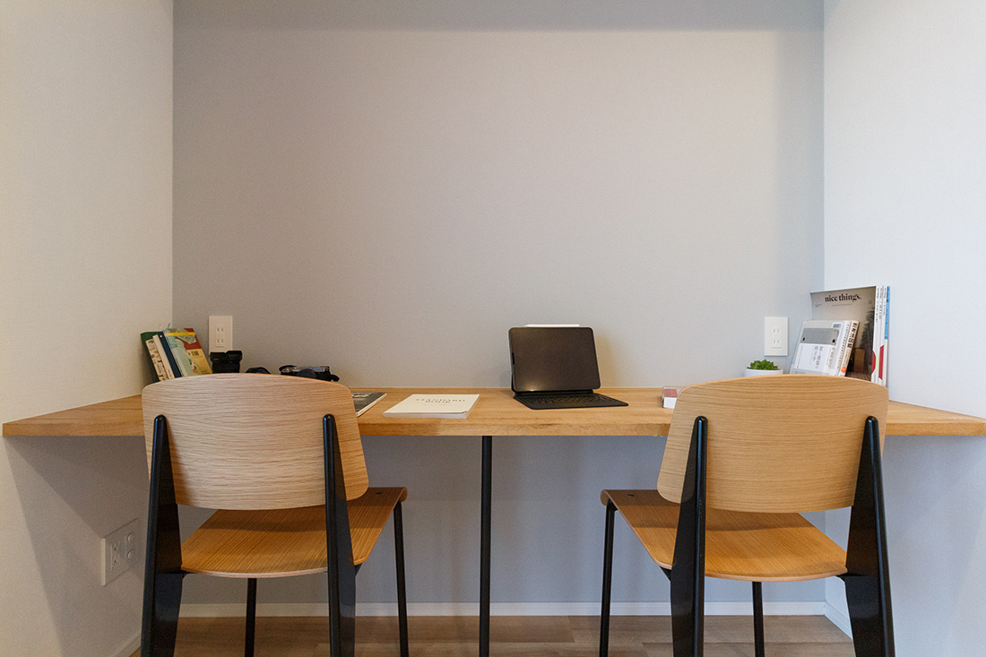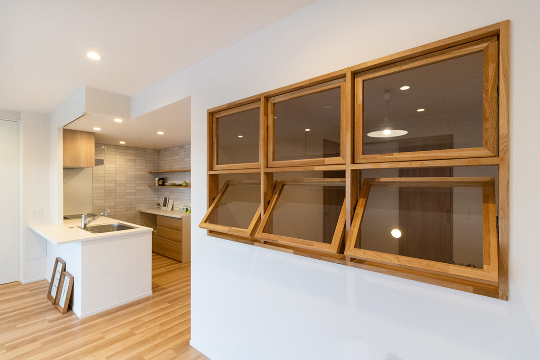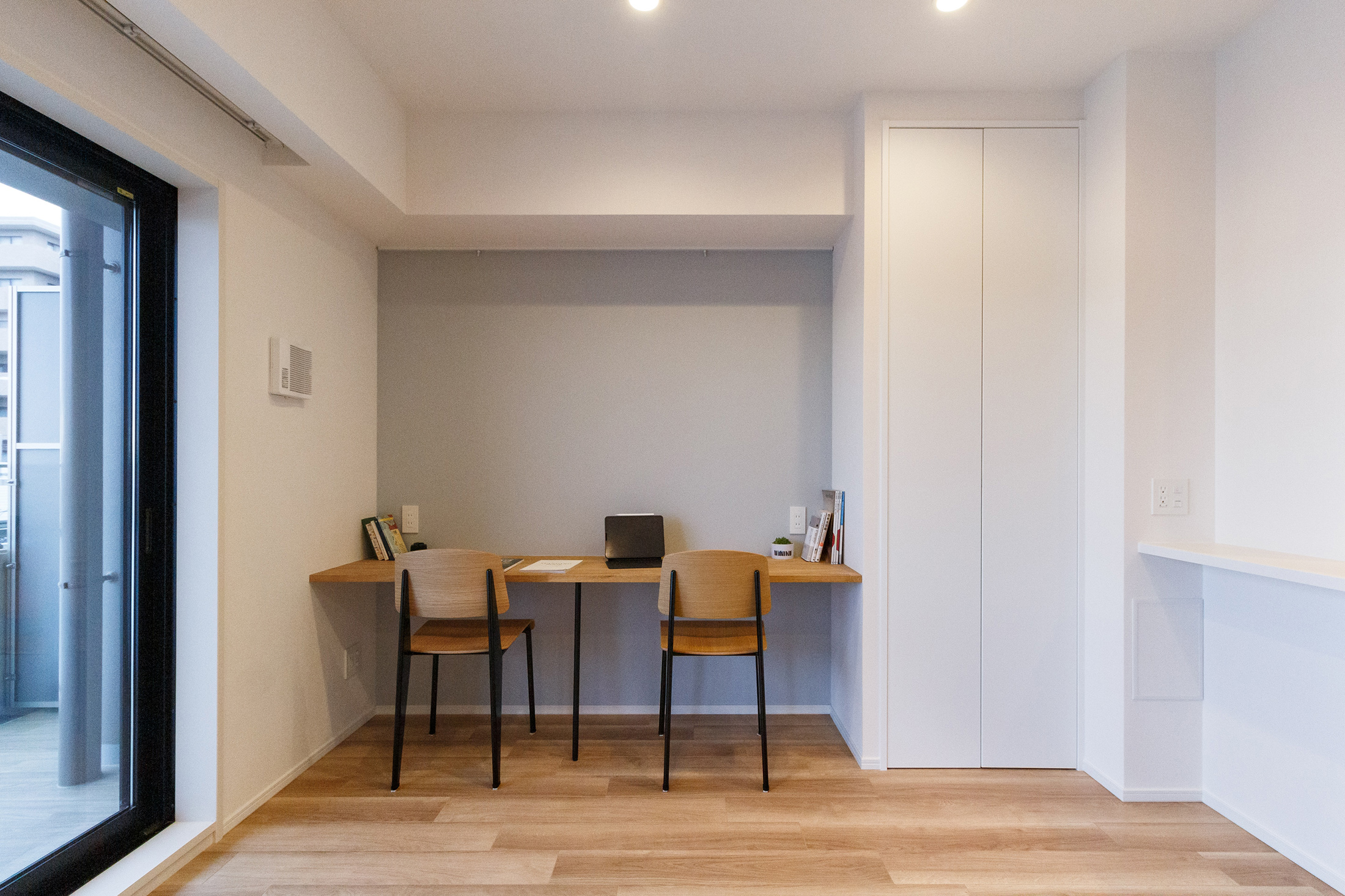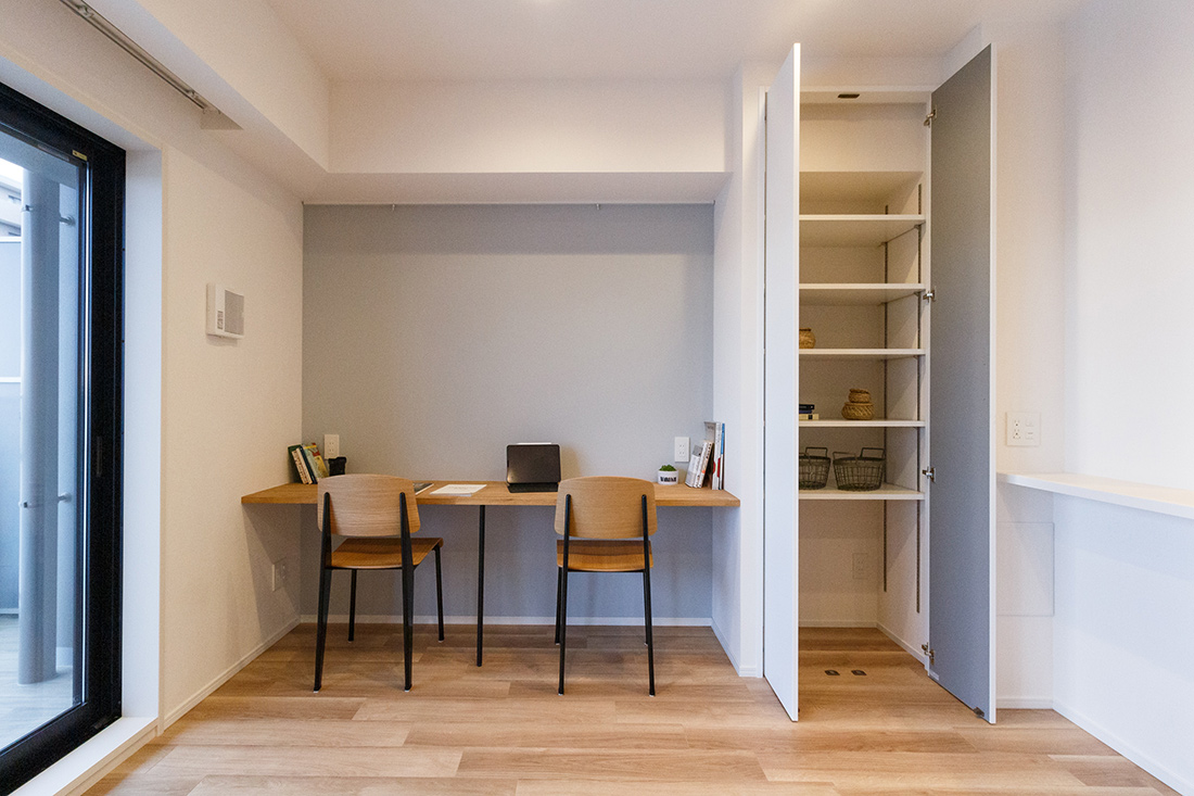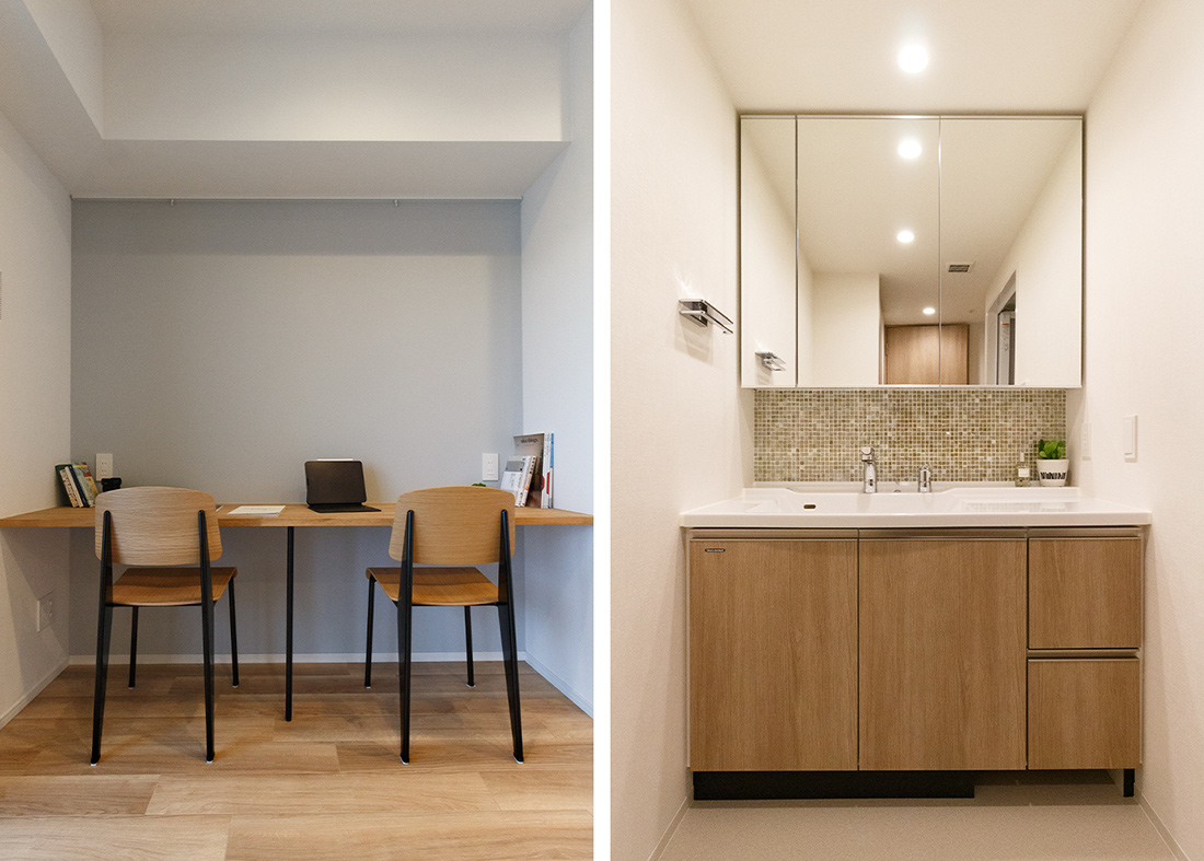 大阪府吹田市、新築マンションの部分リノベーション。キッチンの壁とカップボード背面には、トーンの異なるグレーがランダムに配置されたタイルを使用。タイルの上品さにマッチする落ち着いた色味のウッドシェルフを取り付けました。キッチンから目の届く位置にワークスペースを設けることで、家族がそれぞれの時間を過ごしていても存在を近くに感じることができます。使い勝手の良いワークスペース横のシェルフで本や作業ツールもすっきり収納。ブルーグレーのドアとウッドの室内回転窓がシンプルなリビング空間にあたたかみとアクセントをプラスします。ウォッシュルームは既存の洗面台や床のカラーにマッチしつつ存在感あるデザインタイルをチョイス。部分リノベーションながら、個性やこだわりを叶えた新築リノベーション空間となりました。