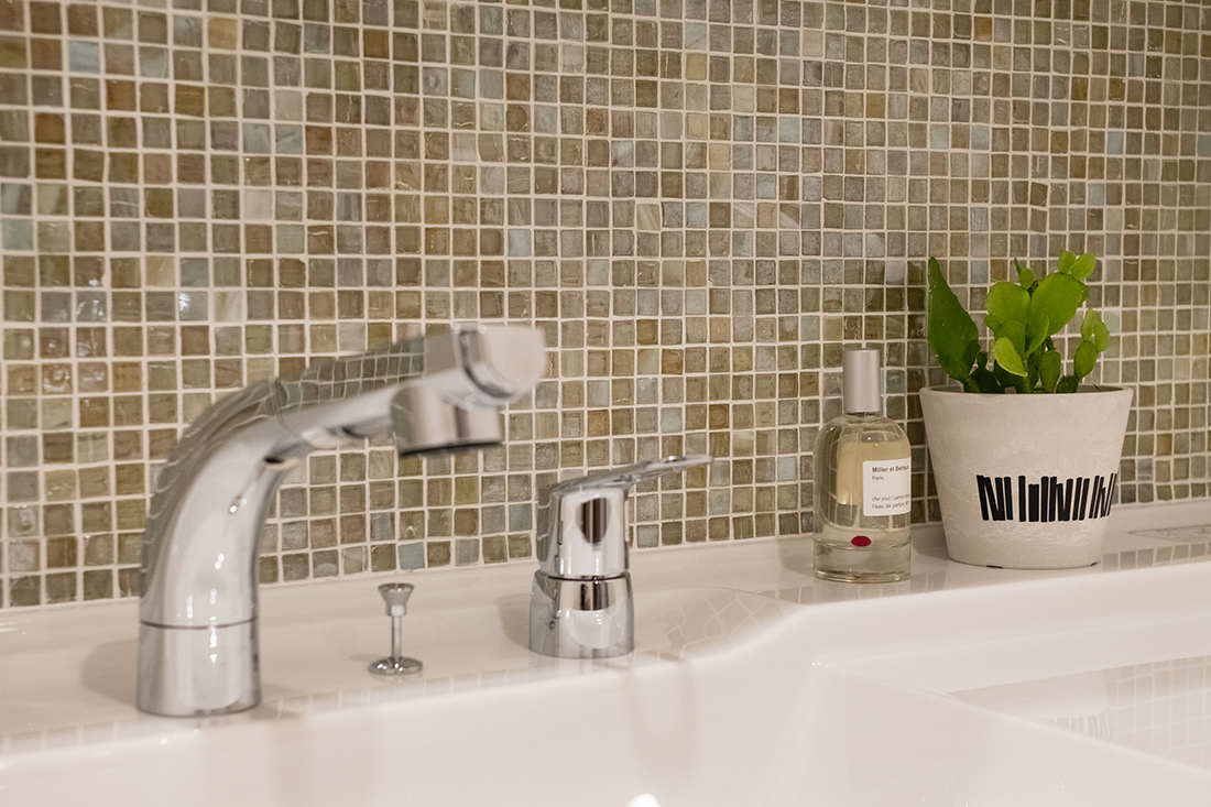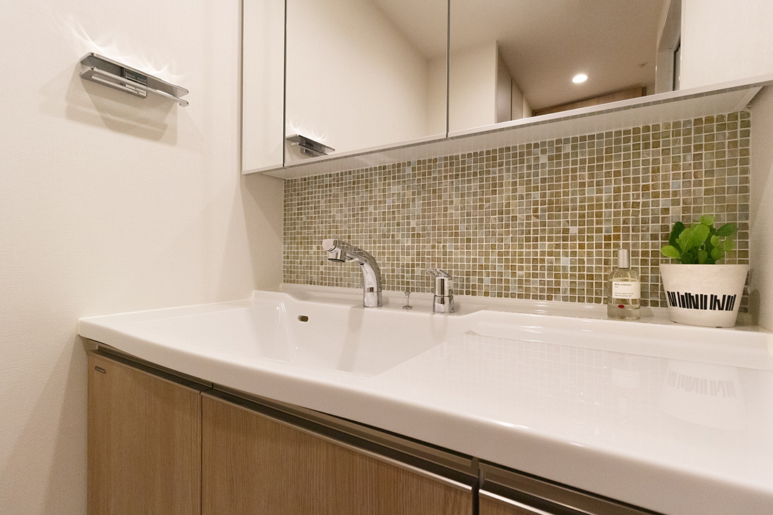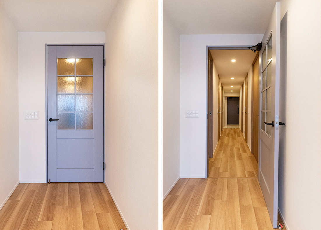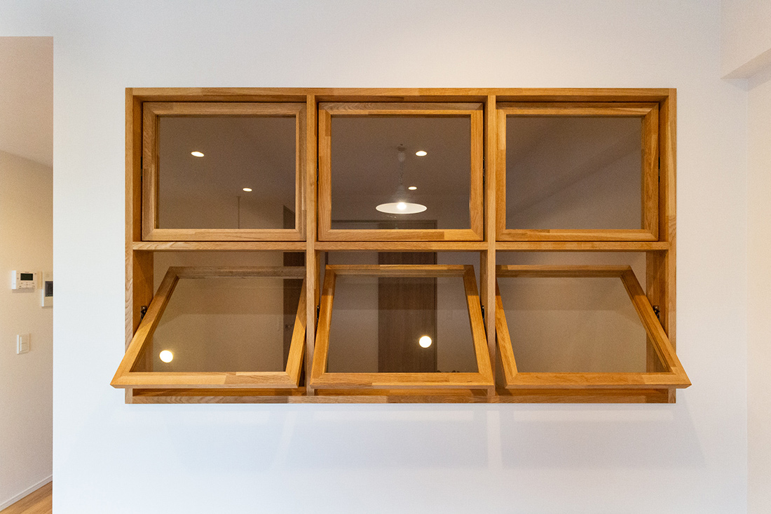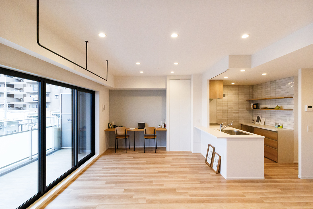 大阪府吹田市、新築マンションの部分リノベーション。キッチンの壁とカップボード背面には、トーンの異なるグレーがランダムに配置されたタイルを使用。タイルの上品さにマッチする落ち着いた色味のウッドシェルフを取り付けました。キッチンから目の届く位置にワークスペースを設けることで、家族がそれぞれの時間を過ごしていても存在を近くに感じることができます。使い勝手の良いワークスペース横のシェルフで本や作業ツールもすっきり収納。ブルーグレーのドアとウッドの室内回転窓がシンプルなリビング空間にあたたかみとアクセントをプラスします。ウォッシュルームは既存の洗面台や床のカラーにマッチしつつ存在感あるデザインタイルをチョイス。部分リノベーションながら、個性やこだわりを叶えた新築リノベーション空間となりました。