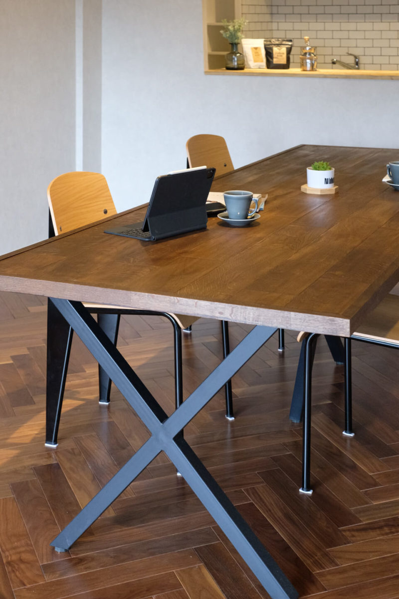 躯体表しの天井とヘリンボーン床のLDKの重厚感に合わせてデザインしたStandardオリジナルテーブルです。