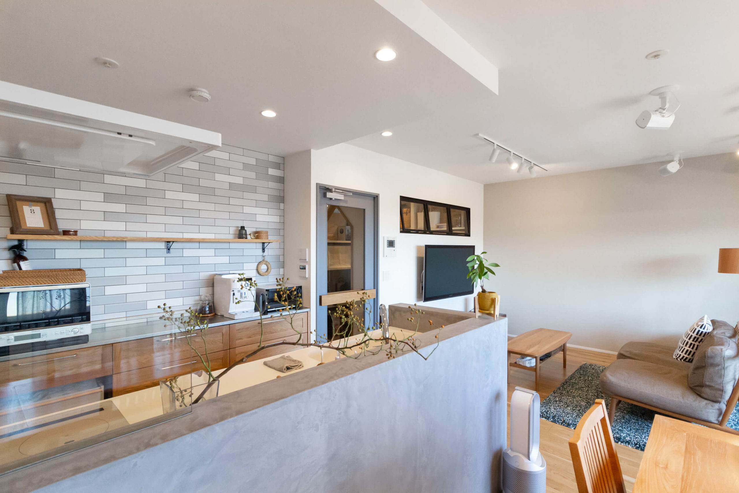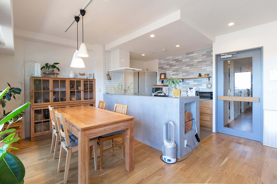 兵庫県神戸市の中古マンションリノベーション。施主様のこだわりとセンスの高いデザイン性を実現した空間。異なるテクスチャやデザインタイルを使用しながら統一感ある洗練された雰囲気となりました。既存のものを上手く活用する工夫を凝らしながらコストを抑えつつこだわりたい部分にしっかりこだわって新しい空間へ。開放感あふれるLDKは北欧デザインを取り入れたナチュラルなテイスト。落ち着いた雰囲気の空間に、ブルーグレーと無垢オークの取手でデザインしたオーダードアがアクセントを持たせます。また、ホールのアーチ開口との相性も良く、LDKからもガラス越しに三角屋根が覗く可愛らしいデザインに。それぞれの部屋には色違いのアクセントクロスを使うなど、飽きが来ず、洗練されたデザイン性や機能性はもちろん遊び心まで取り入れたリノベーション空間となりました。