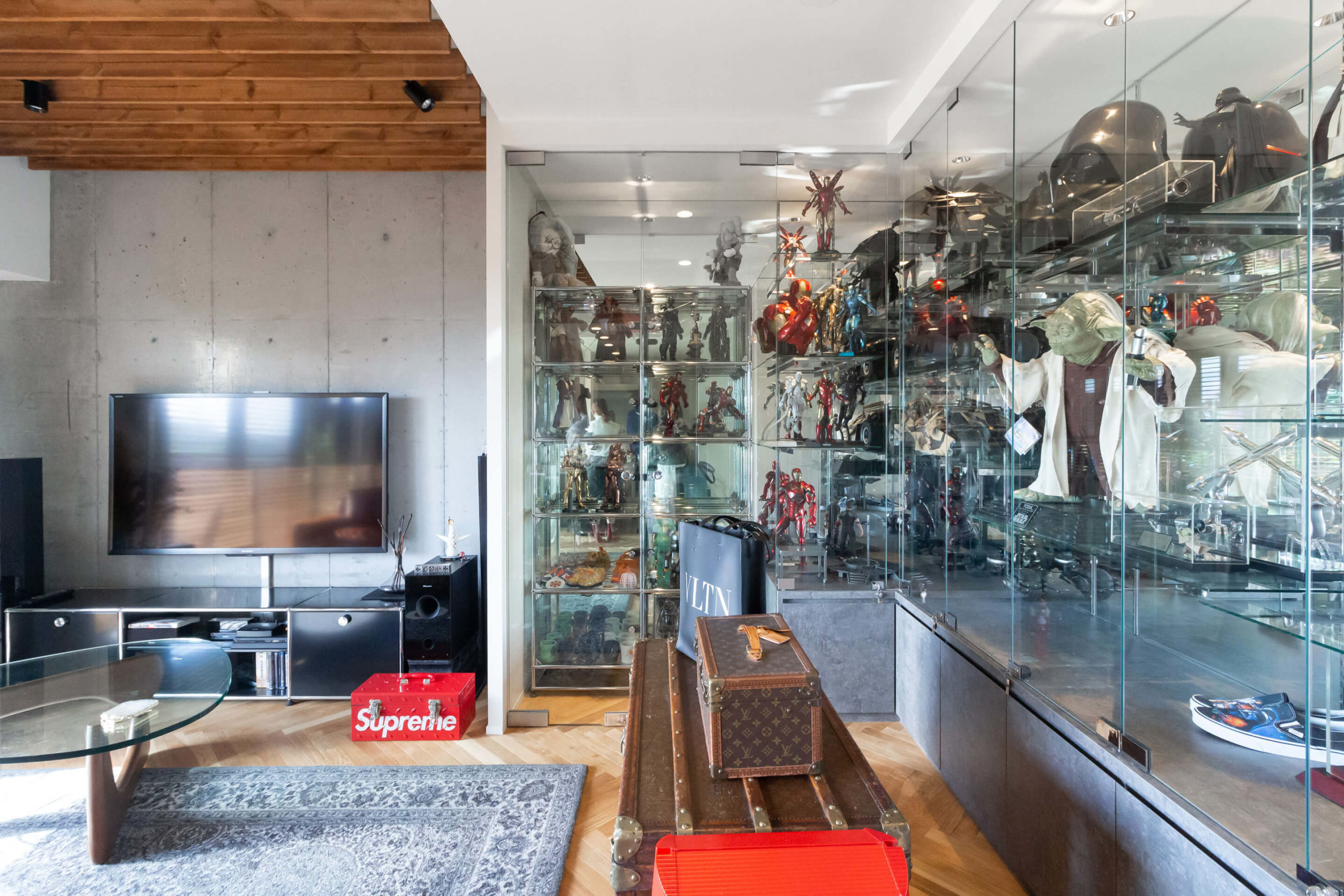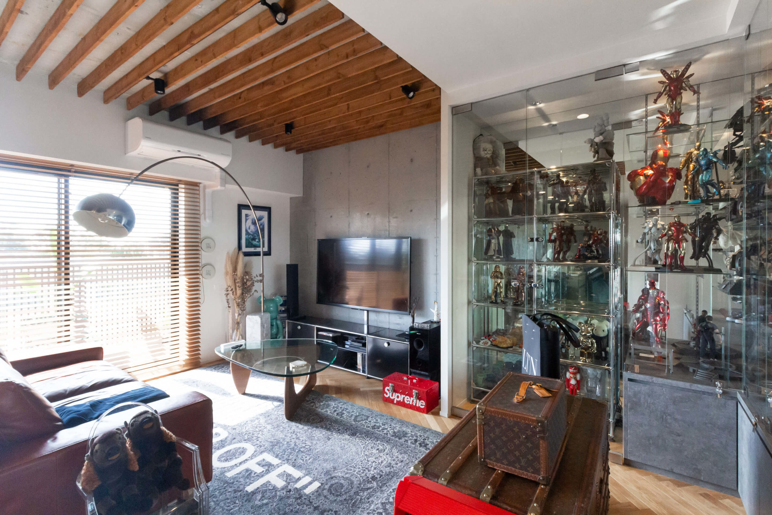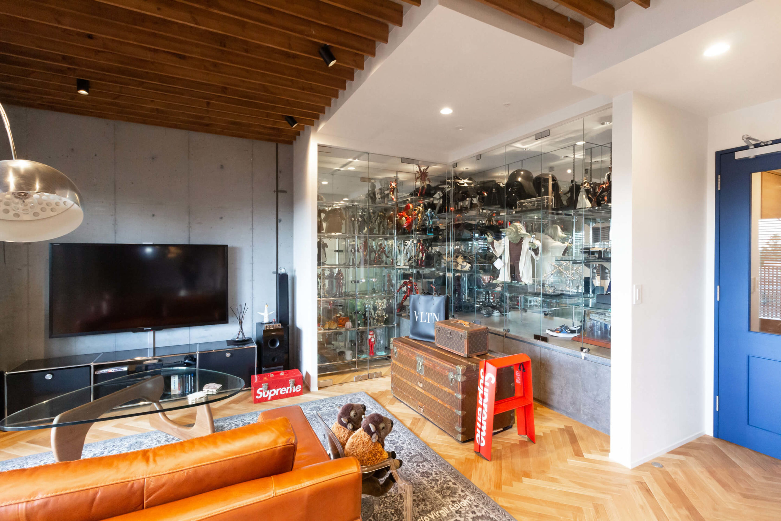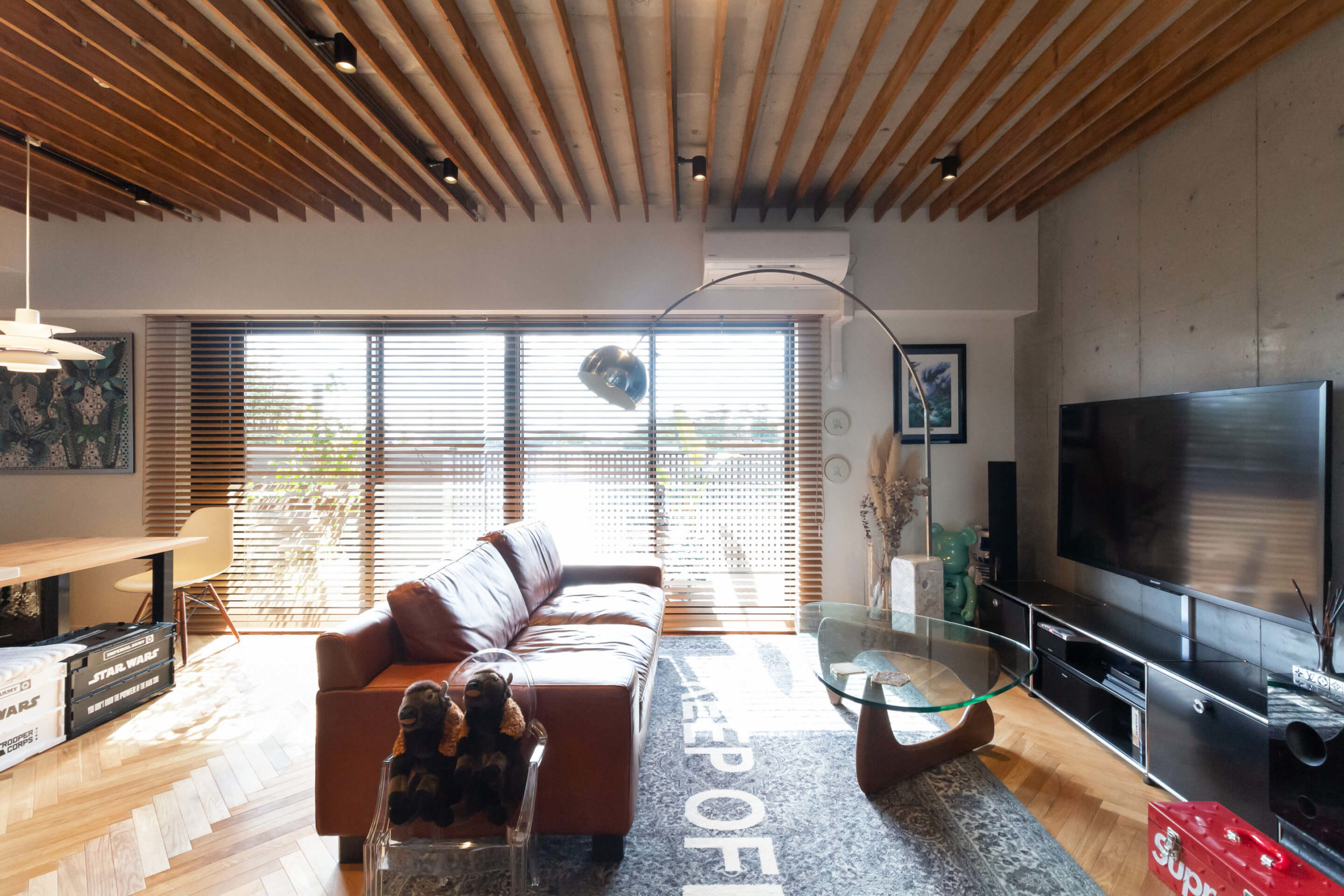 大阪府吹田市の中古マンションリノベーション。エントランスからヘリンボーンで奥行きを強調。ネイビーのオーダードアを開けると、ウッドブラインドから差し込む光がこだわりの家具を包む、センス溢れるくつろぎのLDKへ。まるでショップのようなガラスとミラーのショーケースには所狭しと趣味やアートをディスプレイして。躯体現しのTVボード背面も相まって、迫力あるリビング空間に仕上がりました。天井はウッドのルーバーでデザインし、無骨な躯体にコントラストを。キッチンは造作のカップボードとグレーのウッドを使ったカウンターにこだわりました。空間に馴染むシンプルなデザインですが収納力も兼ね備えます。男性的でワイルドな印象もありながらナチュラルさも持ち合わせ、絶妙なバランスが居心地いいリノベーション空間が生まれました。