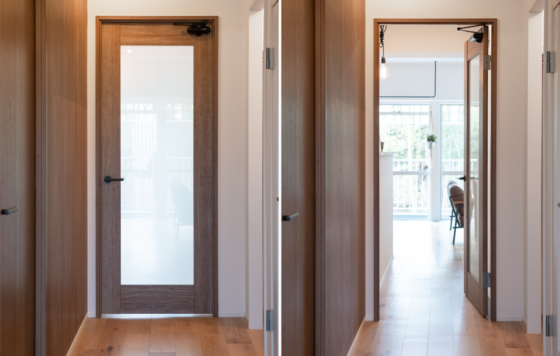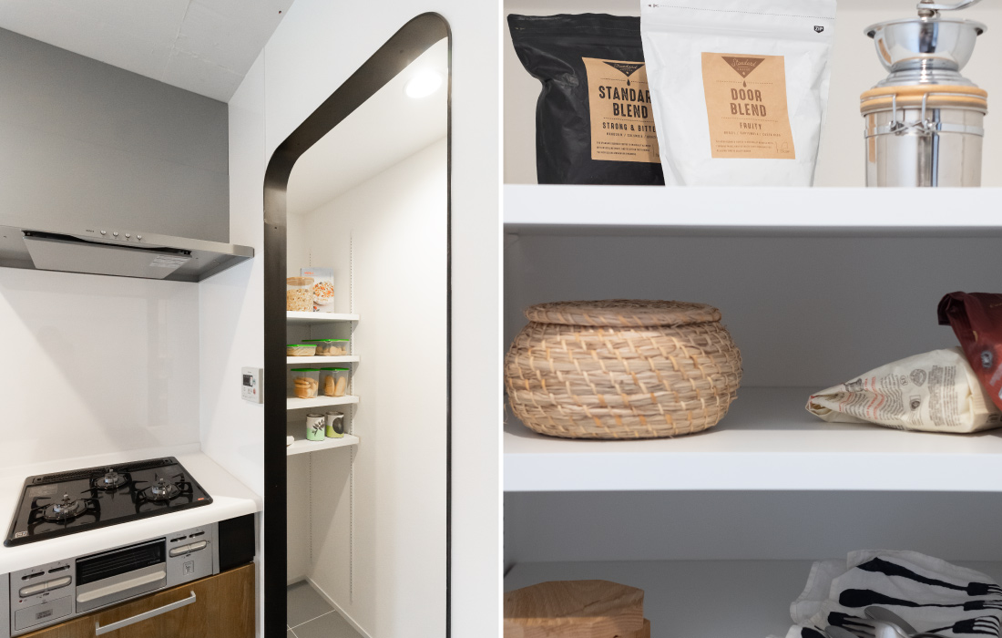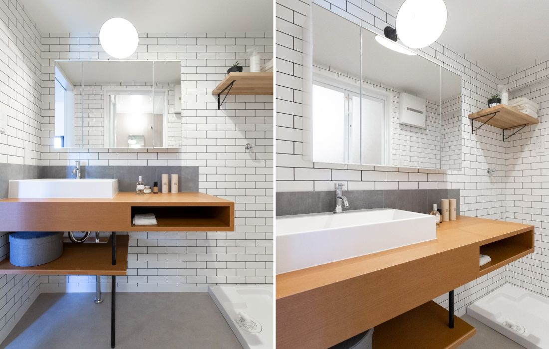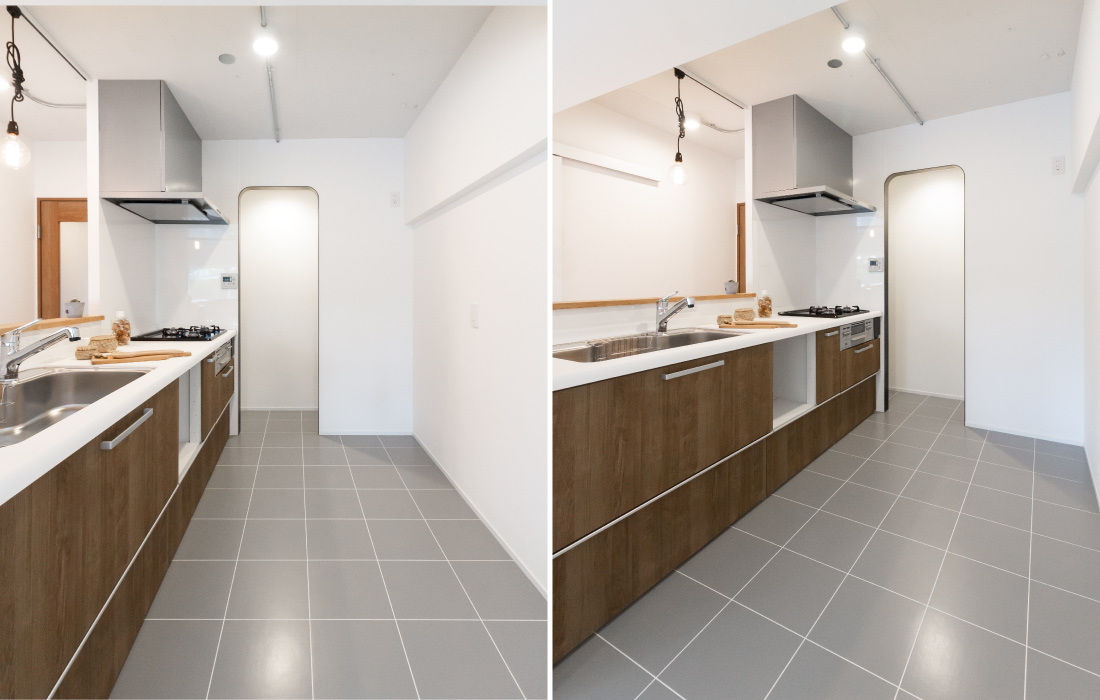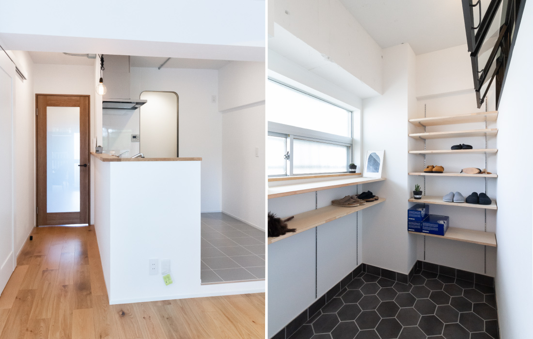 コンパクトなスペースでも広いキッチンスペースを叶え、暮らしやすい生活動線。家族で過ごす時間をよりのびのびと充実したものへ。ベッドルームには開放感をプラスする室内開口をレイアウト。落ち着いた色味で大人らしいデザインかつお子様とも楽しめる、遊び心とこだわりあふれるリノベーション空間となりました。