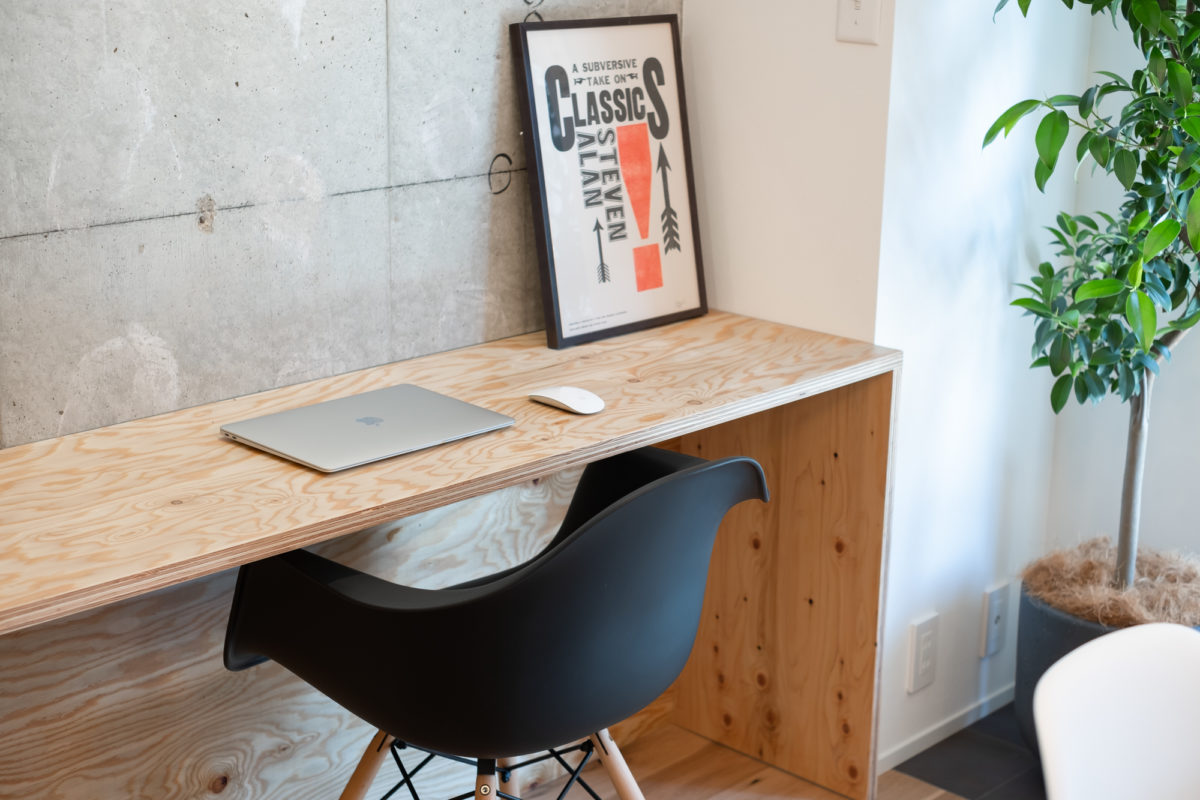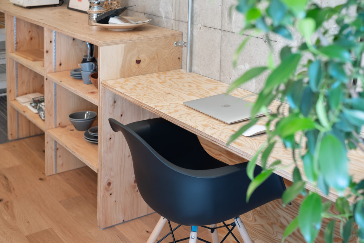 木目が美しいワークデスク&カップボード。ひと続きのデザインによって使い方も人それぞれに広がります。カップボードはキッチンと同じ幅にして、ゆったり使える収納力。そのほか、TVボードやシェルフなど様々なオリジナル家具をデザインし、機能性もこだわり抜きました。