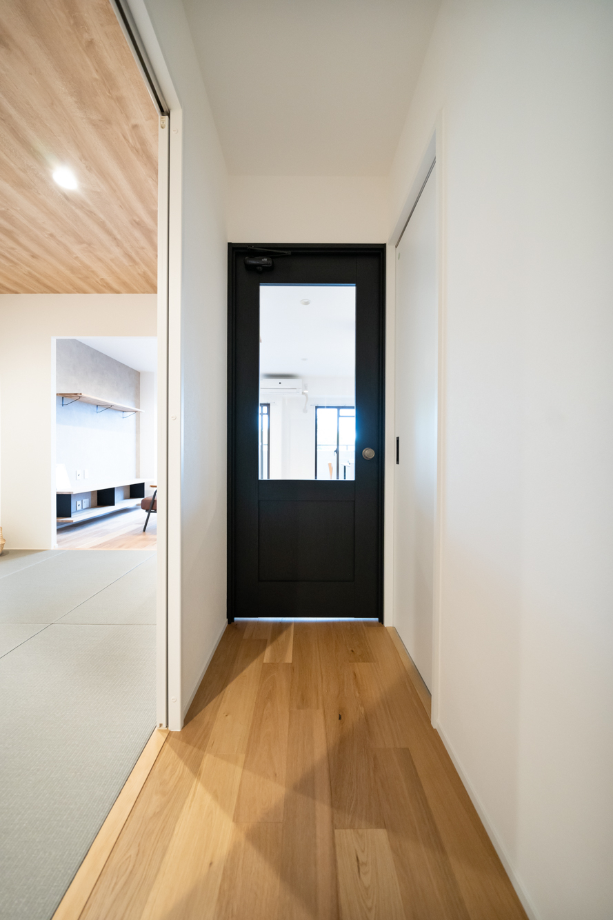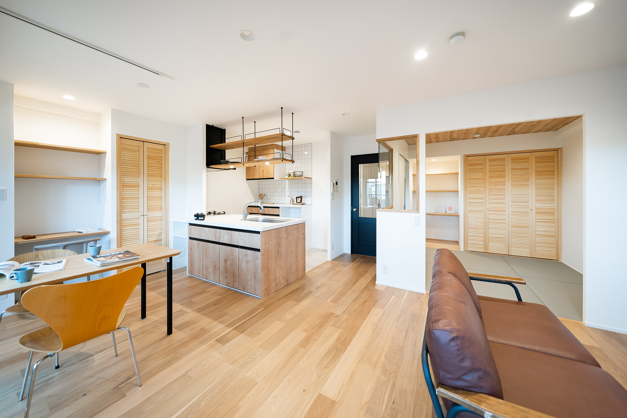 大阪府吹田市の中古マンションリノベーション。木材をふんだんに使用したあたたかみと開放感あふれるLDK。シンプルなデザインの中にルーバーの扉が心地いいアクセント。天井の木目クロスが印象的な和室スペースは広さにこだわり、大きな室内窓によってさらに開放的に。リビングと和室の一角にはそれぞれワークスペースを設けました。各所、空間を有効活用して収納力も抜群。WICはクロスを使用し、まるでコンクリート打ちっぱなしのような迫力を。また、洗面室はモルタル調と白のタイル&フロアで洗練された雰囲気、トイレにはライトブルーのクロスを使うなど、スペースごとに変わるデザインを楽しめるリノベーション空間に仕上げました。