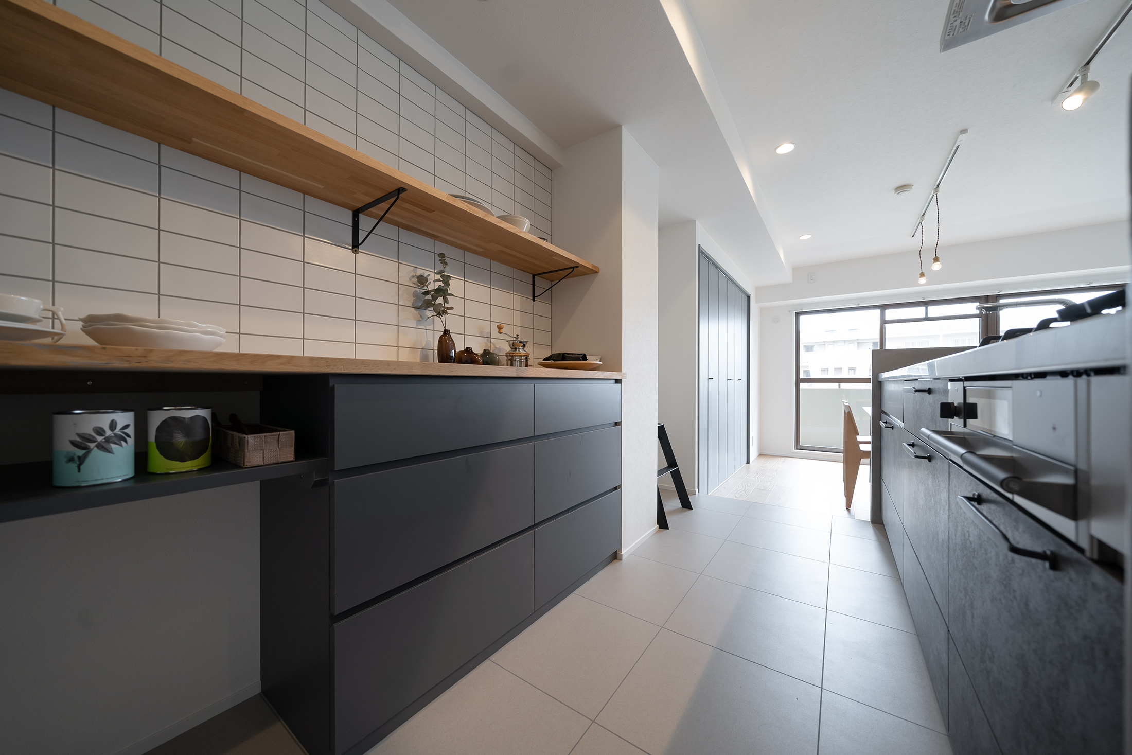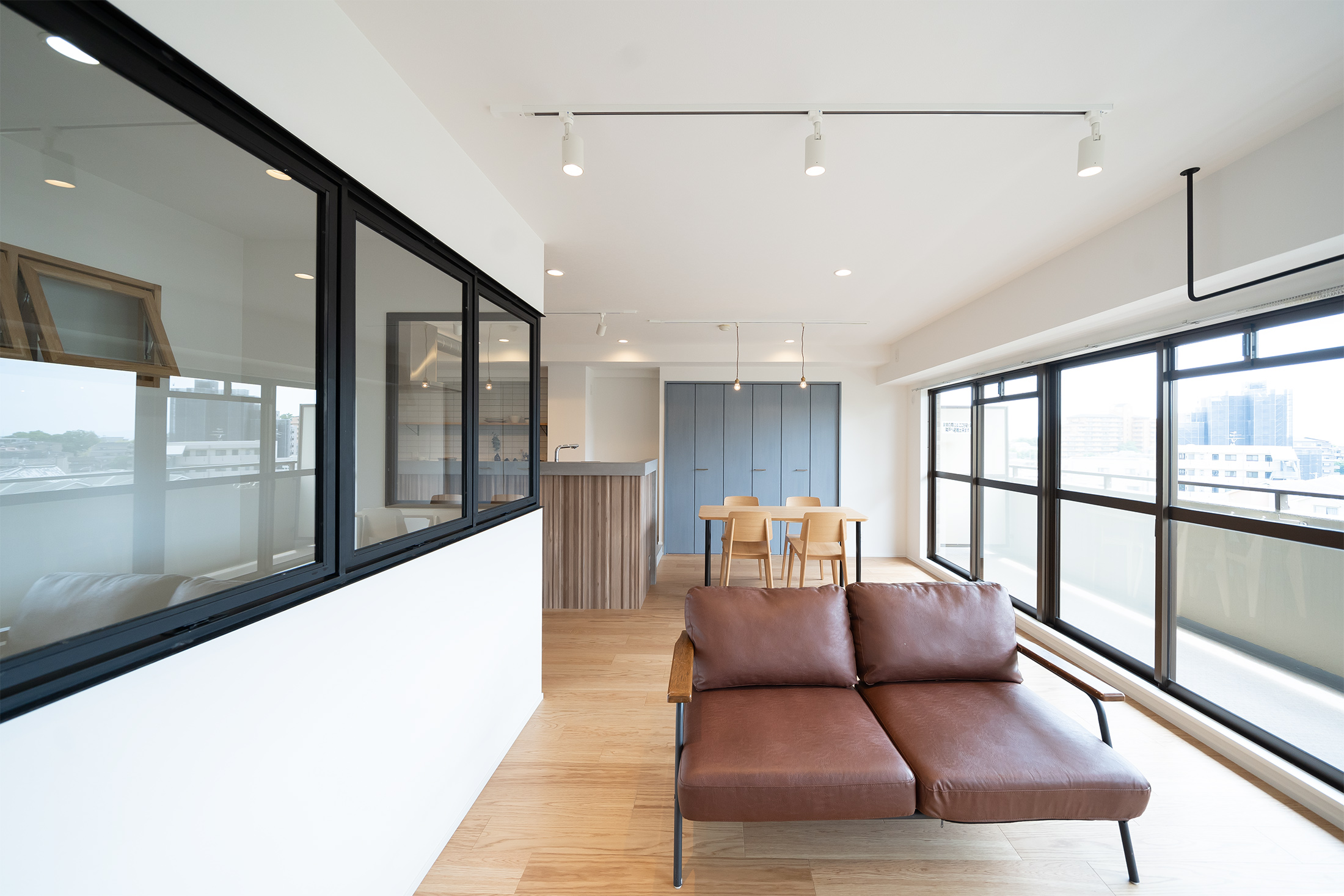 大阪府豊中市の中古マンションリノベーション。エントランスからリビングへは抜け感を意識し、スタイリッシュなガラスのドアで見通しよく。シューズシェルフをはじめ、どの部屋にも十分な収納を設置。可動棚には木材を使用し、オシャレにディスプレイも楽しめます。開放的なリビングのアイアン室内窓は、空間のつながりと広がりをもたらしてくれます。淡いブルーの収納ドアや、やさしい色味の木目クロスをセレクトしつつ、キッチンはダークカラーとすることで空間にコントラストを。グレーのクロスとタイルで大人っぽくまとめた洗面台はワイドで使いやすい設計。洗面ルームの天井には便利なアイアンバーを設けました。各所の機能性や空間のつながり、各部屋へのアクセスの良さにこだわり抜いた居心地いい空間が完成しました。