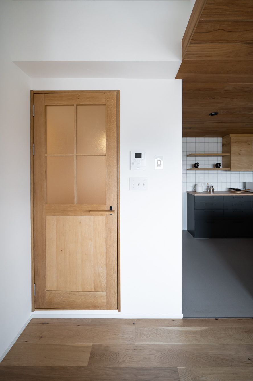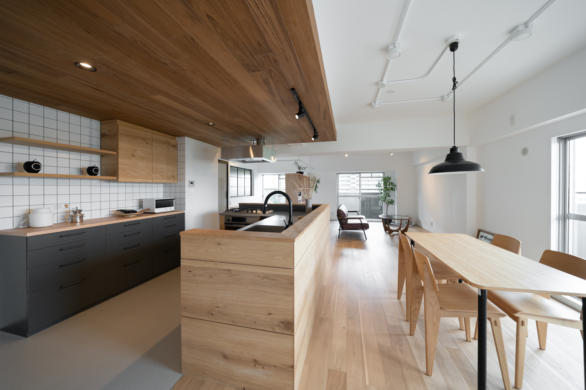 大阪府豊中市の中古マンションリノベーション。キッチンを特にこだわり、カウンターやカップボード、吊り棚まですべてオリジナルで造作させていただきました。収納力はもちろん、カウンターの隠し扉も遊び心あるこだわりポイント。調理スペースに立つと目の前には一面の大きな窓、綺麗な景色が広がります。そしてシンプルにまとめたリビングとワークスペースの間には木製のシェルフを。お気に入りの本やアート、植物などを飾って空間を自由に彩ることができます。ワークスペースにはリモートワークなどを行う際に半個室にもできるようカーテンポールを設置。室内窓とホールへの扉はアンティークガラスと細いアイアンフレームでスタイリッシュに。エントランス、ホール、洗面、ウォッシュルーム、各個室、LDKとひと続きの回遊性のある設計。豊かでスムーズな暮らしを叶えるリノベーション空間が完成しました。