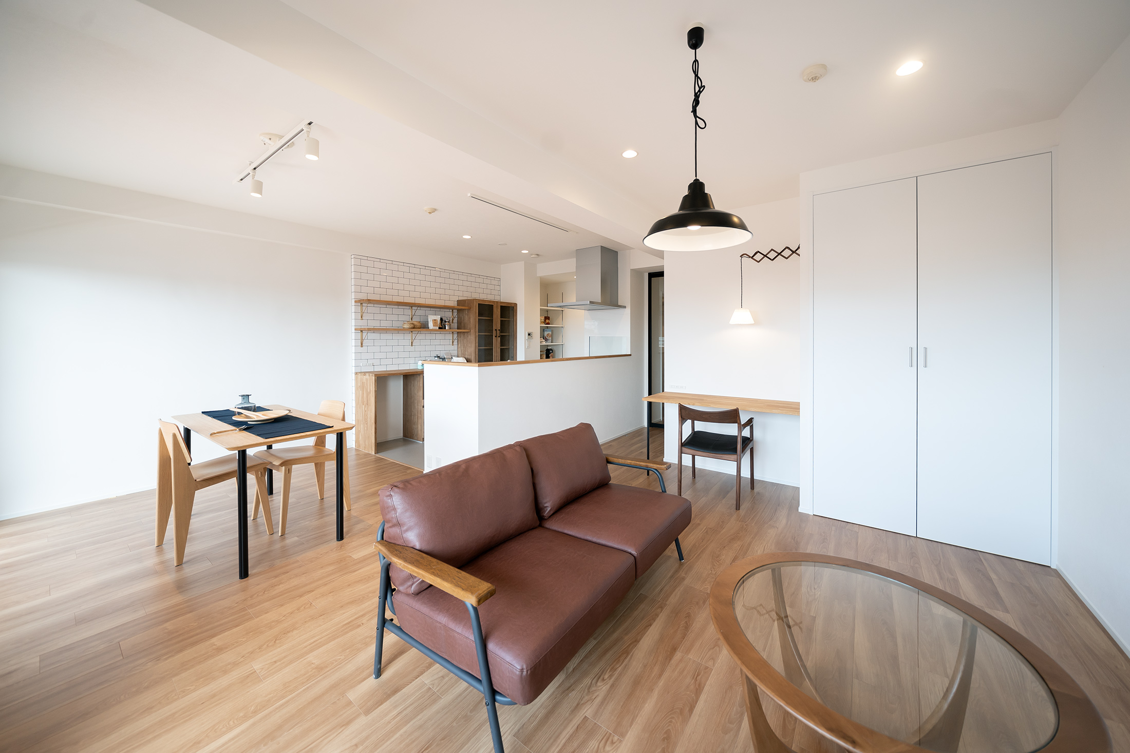大阪府豊中市の中古マンションリノベーション。シンプルなLDKに、ワークデスクやカウンター、カップボードなど木材の色味が合わさることでメリハリが生まれ、ぐっと居心地良い空間に。施主様お手持ちの食器棚はオリジナル造作家具を組み合わせてカップボードに生まれ変わらせ、壁面シェルフも統一してデザイン。タイルを活かしながらさりげなくおしゃれに魅せる真鍮がポイントです。ミニパントリーと合わせて収納力たっぷりの使い勝手いいキッチンに仕上がりました。ダイニングの照明レールは、テーブルの向きに合わせて動かせる仕様をチョイス。心置きなく模様替えを楽しめます。また、キッチンから眺められる場所にワークデスクをレイアウトし、それぞれの時間を過ごしていても家族の存在をそばに感じられます。洗面やトイレ空間はLDKと印象を変え、落ち着いた雰囲気を演出しました。広いエントランスは曲線がかわいい飾り棚がこだわり。遊び心を各所にちりばめたStandardらしいリノベーション空間に仕上がりました。