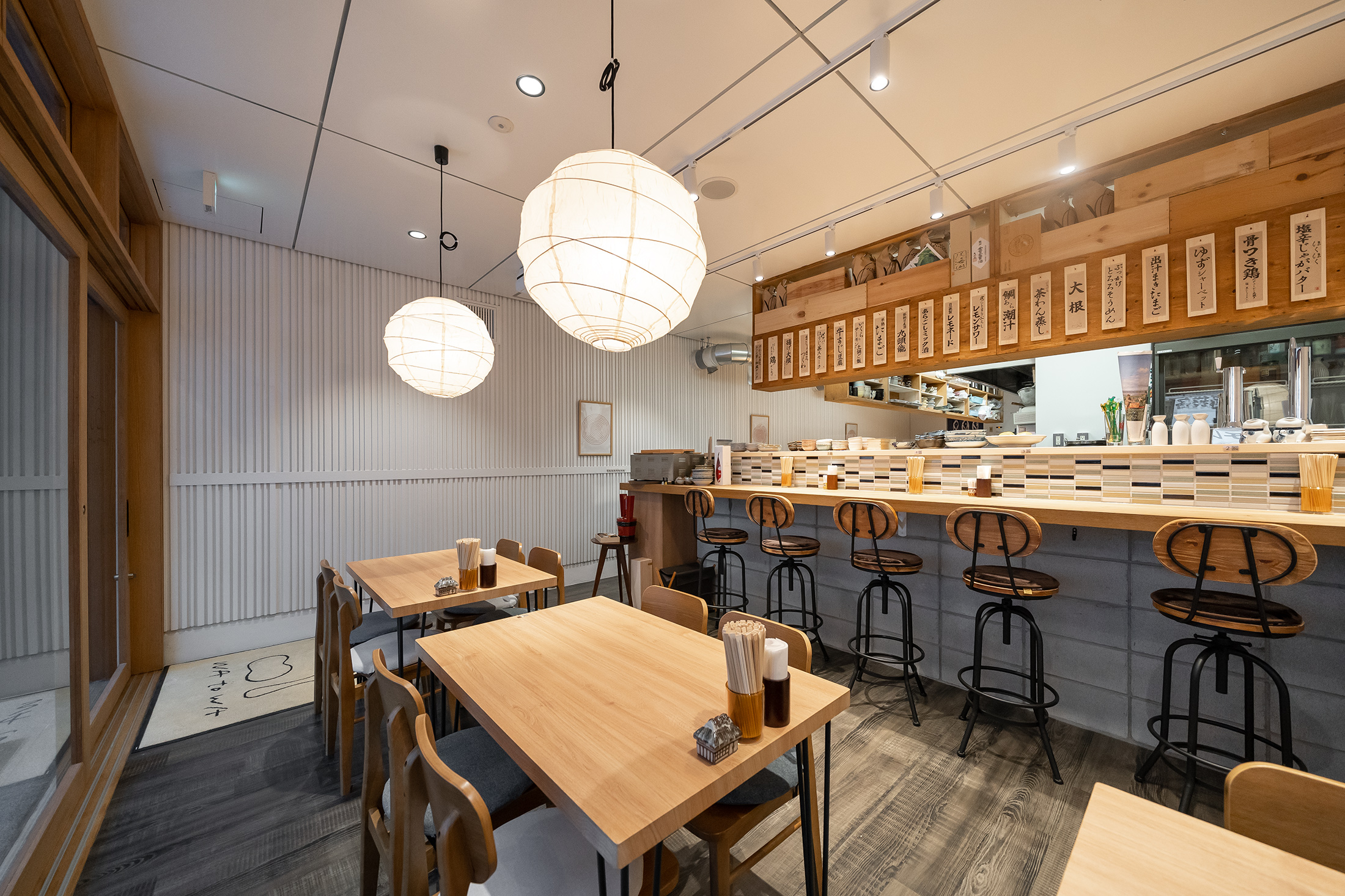 大阪府高槻市に出汁居酒屋WAtoWAがオープン。女性1人でも入りやすいようにというテーマのもとデザインさせていただきました。のれんや提灯によって和を取り入れつつ、カジュアルな雰囲気を演出。店内からのあたたかい明かりとオープンな外観が道ゆく人の目を惹きます。メインのこだわりは、店内とテラス席を一体にできるオープン扉。全面ガラス張りで元々開放的ですが、気温が心地いい季節には開け放ってさらに開放感を味わえます。店内は白を基調に、木材やランダムなカラーのタイル、コンクリートブロックなどの異素材をバランスよくセレクトし、すっきり見せながらも楽しさあふれる空間に。 洗面スペースやトイレ空間はダークカラーでメリハリをつけつつ、トイレのドアサインに和のエッセンスと遊び心を。元々ガレージだった場所がリノベーションによって居心地いい居酒屋に生まれ変わりました。こちらは、店舗デザイン・設計施工からロゴやメニュー表、サインデザインなどトータルでお手伝いさせていただきました。