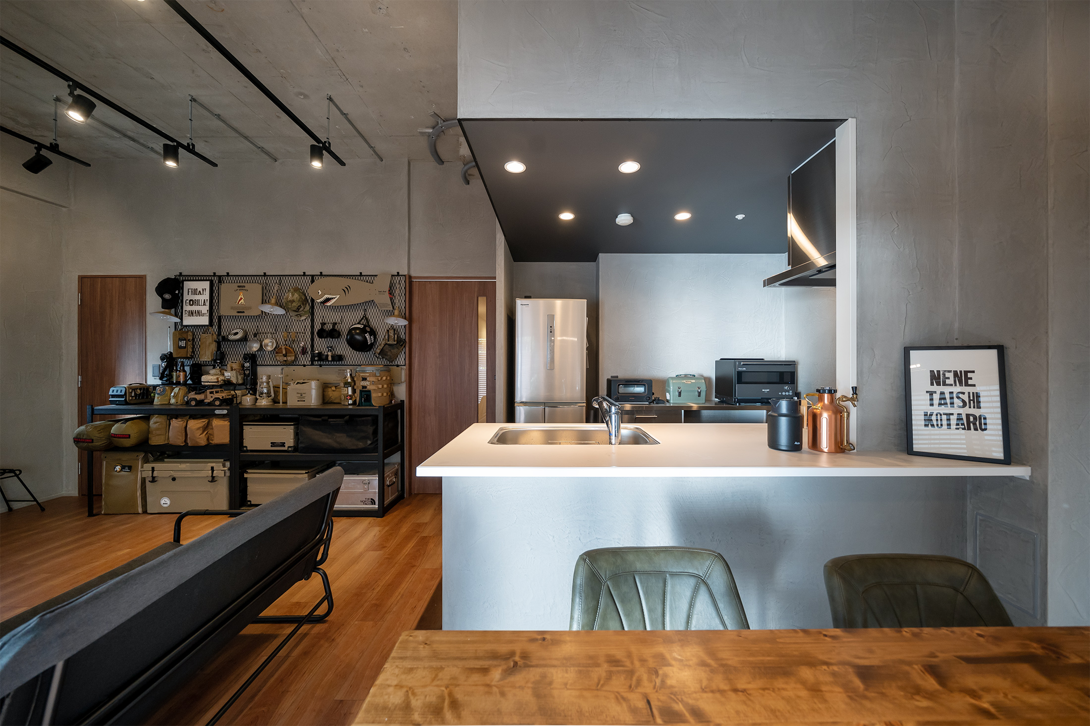 大阪府大阪市の新築マンションリノベーション。リビングダイニングの天井を躯体現しにすることで、無骨でクールな雰囲気が好みの施主様理想の空間へ。また、天井の高さが確保されたことによって格段に開放感が生まれました。壁面はモルタル調の塗装にすることで、躯体現しとの統一感が生まれ、落ち着いた雰囲気に。リビングの一角、オープンシェルフには趣味のキャンプグッズを自由にレイアウト。収納の機能を兼ね備えつつ、いつでも眺めることができる癒しのスペースに。暮らしやすさと趣味を共存させ、まるで秘密基地のようにいつまでも居たくなるリノベーション空間に仕上がりました。