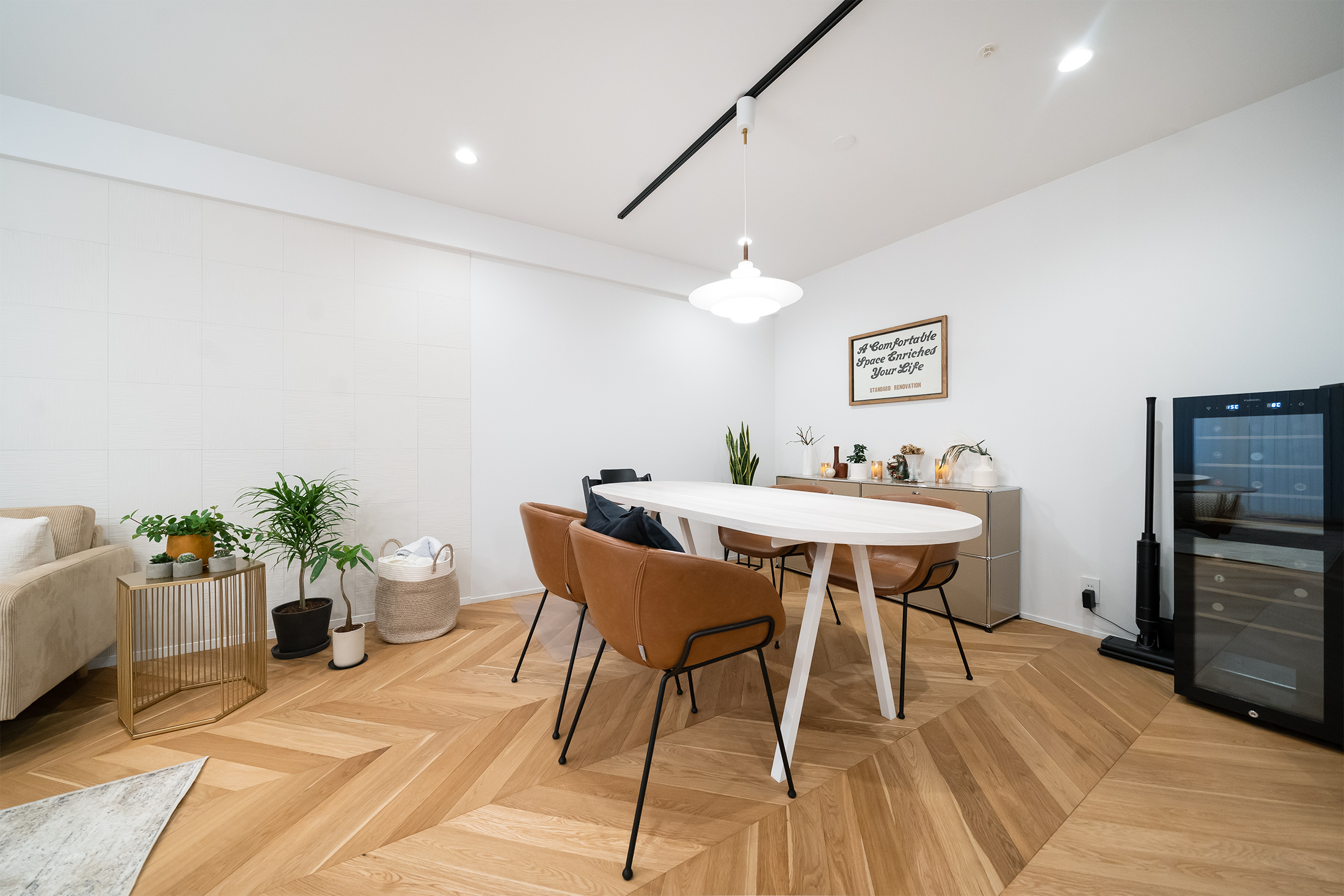 兵庫県三田市の中古マンションリノベーション。2部屋分をなくしてLDKと一体にすることで、広く開放感あふれるリビング空間が実現。白を基調とした空間にブラックのドアがアクセント。ご夫婦ともにリモートワークがメインの生活のため、キッチンカウンターにまでコンセントを設けて、部屋のどこでも仕事が可能になりました。書斎は壁から床まで、個性あるアクセントクロスやカーペットをセレクト。デスク背面の壁にはシェルフを設け、本を出版されているご主人こだわりのスペースに。エントランスも広く、帰ってすぐコートを脱ぐことのできるスペースをレイアウト。収納扉にはミラーを設置、続く廊下は個室の壁をセットバックにするなどより広さを感じられるよう工夫しました。また、廊下からLDKまでの床をヘリンボーンでひと続きにすることで奥行きとダイナミックさが感じられます。こちらの物件は、オーダーダイニングテーブルの制作や空間に合わせた家具選びなど、トータル的にお手伝いさせていただきました。