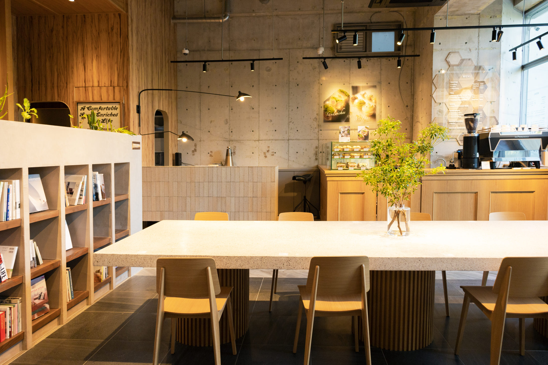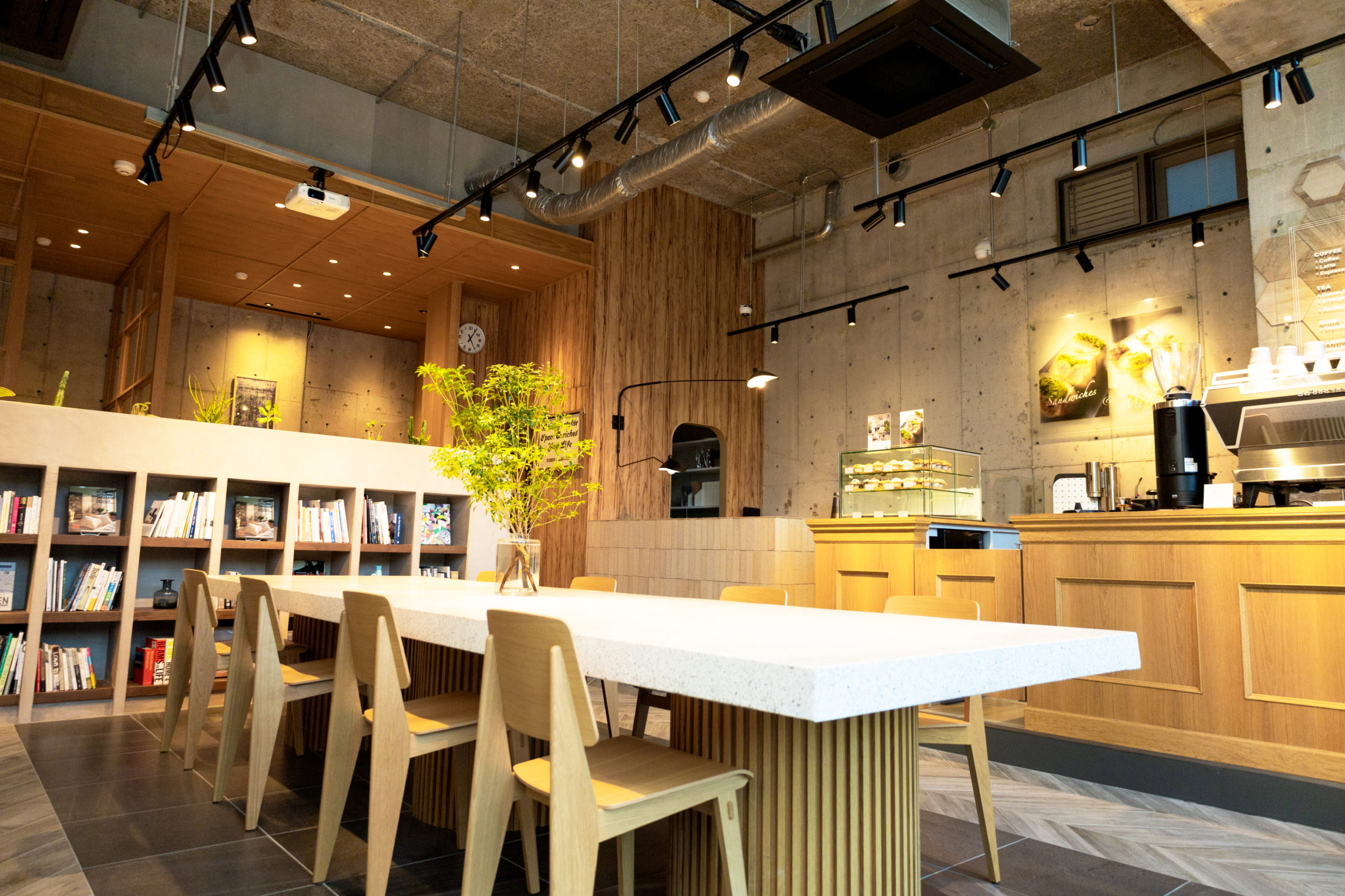 大阪市西区は靭公園沿いにある全面窓の開放的な物件を当社、株式会社Standardのリノベーションギャラリー 兼 カフェへと施工しました。躯体現しの天井と壁面広がる空間。入口側の敷地の約3分の2を占めるカフェスペースは、床面にグレー基調の四角タイルを斜めに特注カットしてヘリンボーンになるよう敷き詰めました。センターに配置されたビッグテーブルは石材とウッドを組み合わせたインパクトある造作家具。壁面側にはぴったり配したバーンウッドとブラウンのレザーで組み合わせたソファを設置。奥にはカフェスペースと商談スペースを仕切る本棚 兼 植栽が。こちらはモールテックスと木材という異素材をミックスしたデザイン。これ以外にも至る所にリノベーションギャラリーとしてお客様が想像できる素材感を多種、デザインに取り込んでいます。家具やアートのインテリアにもこだわり、フリーでお読みいただける本もご用意しました。訪れる人々にきっと、インスピレーションを与える空間であると思います。定期的に開催するイベントや一般の方が会議や会食などに使えるリザベーションスペースもあり、コミュニティも生まれる場所でもあります。全体的にグレーとブラウンと木素材で、落ち着きある空間に全面窓から広がる靭公園の緑が心の安らぎを与えてくれる株式会社Standardの理念である「 居心地いい空間 」が完成しました。