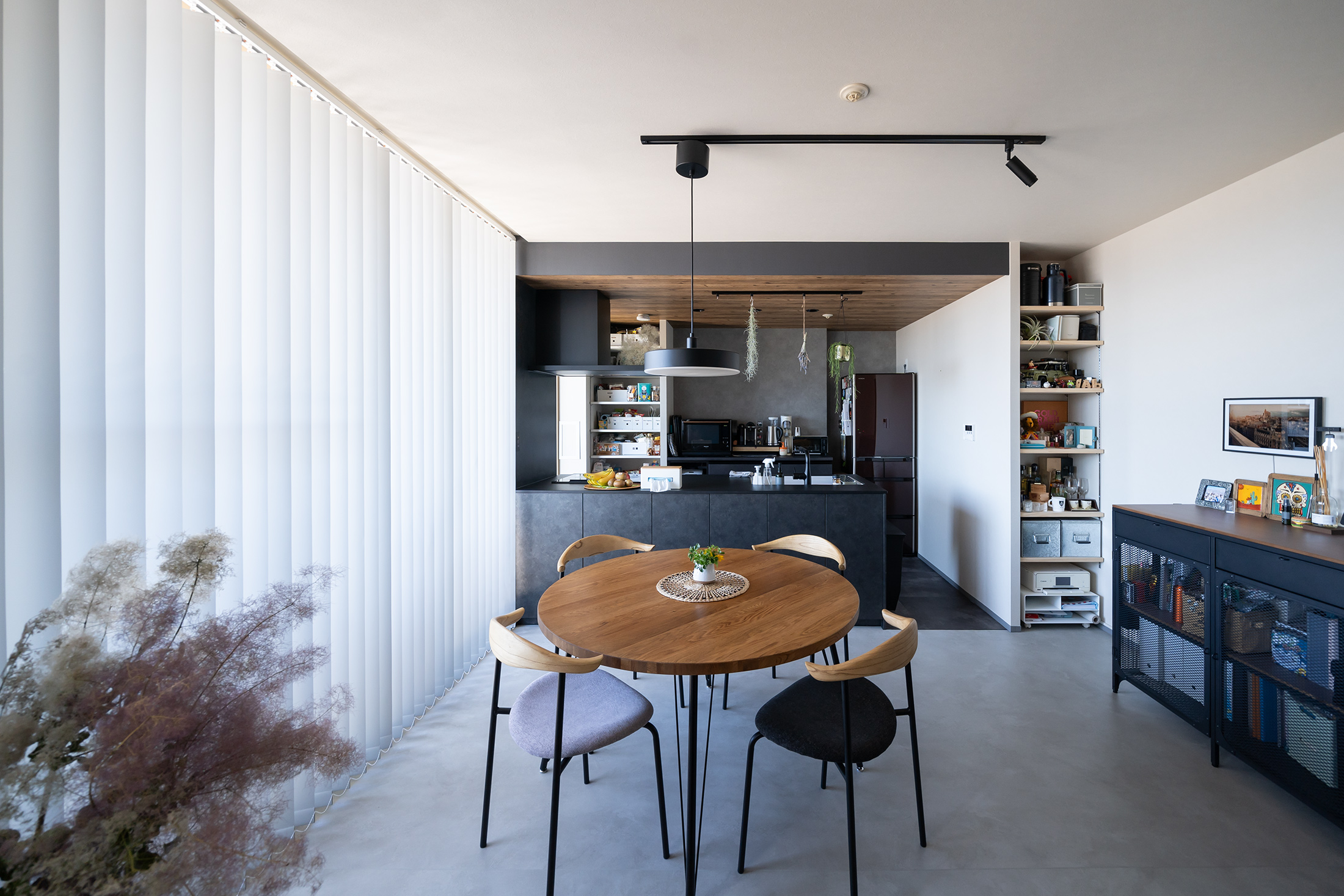 大阪府池田市の中古マンションリノベーション。インダストリアルスタイルがお好みだという施主様のお家は、グレージュ色をベースに黒色とウォールナットが締め色として映える大人かっこいい空間。床にはフロアタイルを採用し、フローリングとはまた違う素材感の仕上がりとなりました。キッチンは対面型にレイアウト変更することで、開放的かつ家族のコミュニケーションが取りやすい間取りへ。下がり天井の木目クロスや黒色のキッチンカウンターが、お部屋をさらにモダンな印象に引き上げます。リビングの壁一面には青色のアクセントクロスを使用、アートや雑貨も映えてお部屋のポイントとなりました。リビングからWIC、主寝室へは回遊ができる間取りで、スムーズな生活導線。また各部屋の建具は、既存の扉へ黒色のシートを貼り雰囲気を刷新しています。全体として統一感ある素材や色味を使用することで、モダンで大人かっこいい空間を実現し、さらに家族の暮らしやすさにもこだわった居心地いい空間が生まれました。