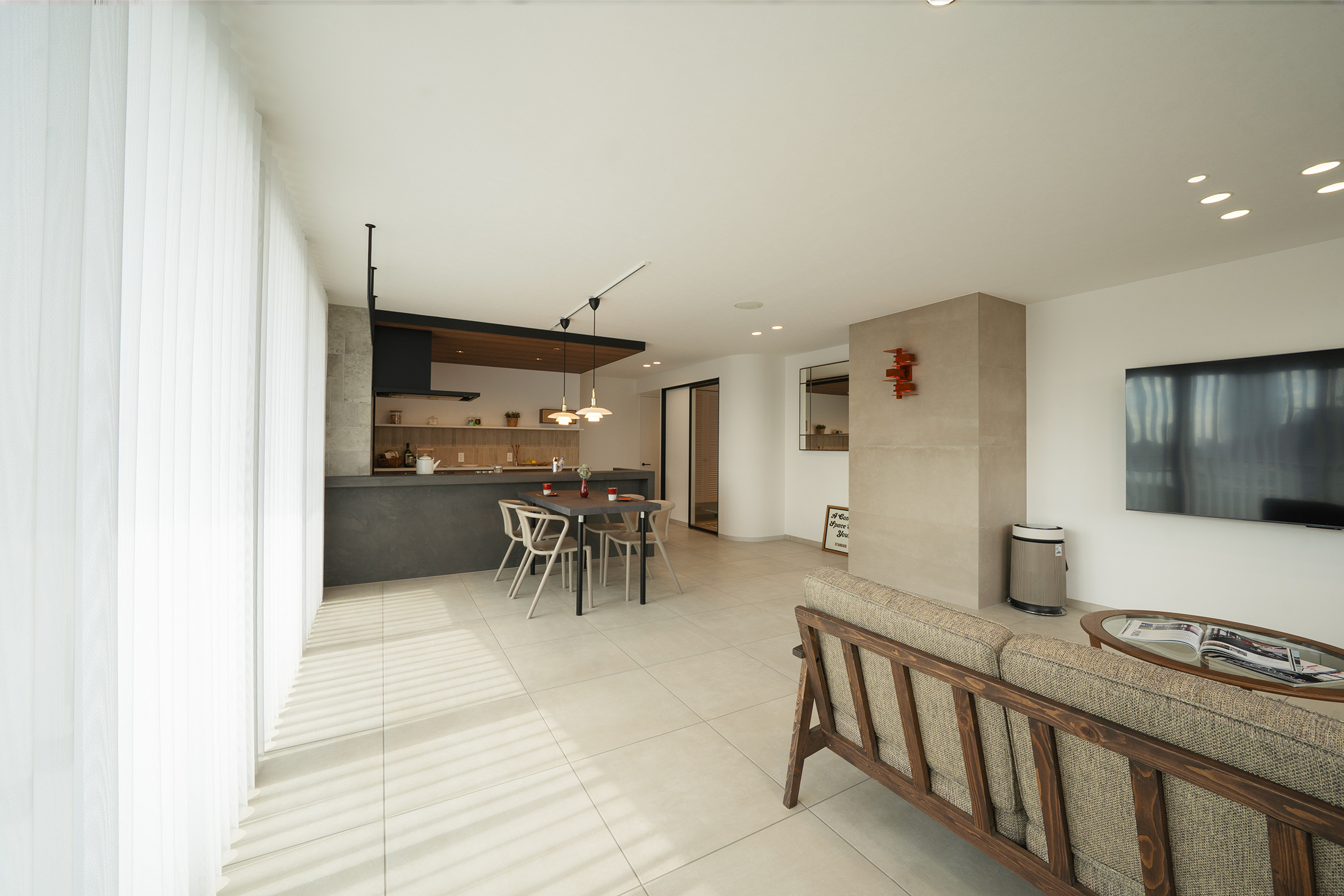 LDKは床を全面タイル張りにし、リゾートホテルのような一体感とモダンな雰囲気を演出。特にダイニングキッチンでは、モールテックスの質感を活かしたカウンターと、ウォルナットの天井クロス、そしてペンダントライトが重なり、まるでホテルダイニングのような上質な空気を感じられる空間に仕上げました。