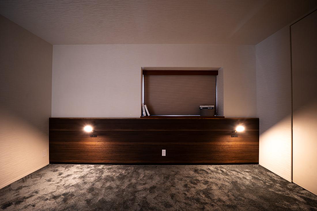 寝室のヘッドボードには調光式の壁付照明を設置し、ホテルライクで落ち着いた雰囲気に。床材は書斎とは異なる風合いのロールカーペットを採用し、お好みのブルーがアクセントとなった上質な空間となっています。
