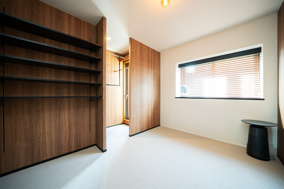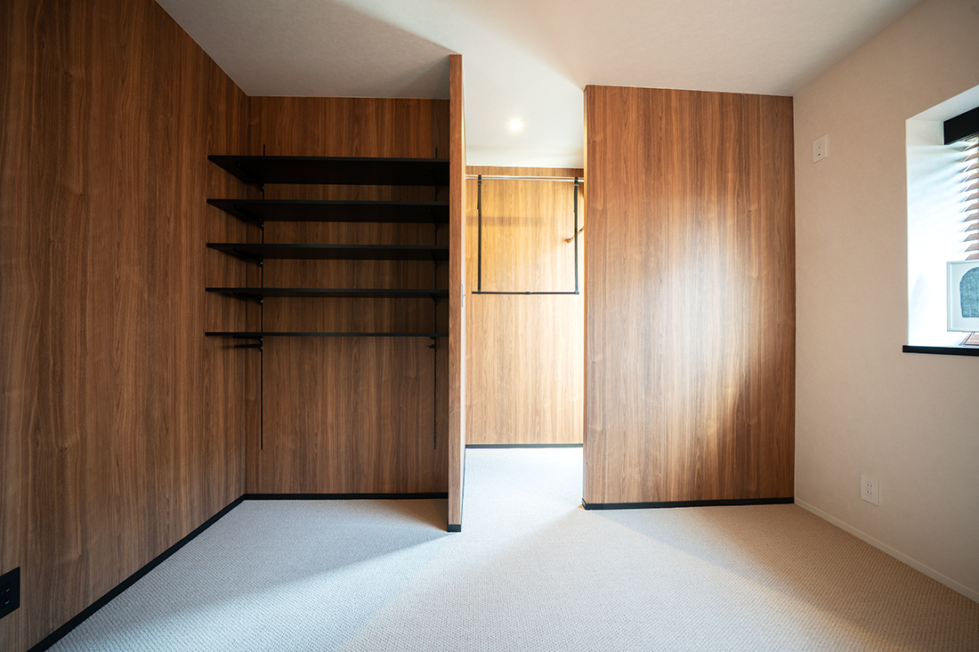 寝室に隣接して新設したスタディールーム&クローゼットは、ウォルナットの木目クロスと黒の棚板、ベージュのカーペットが美しいコントラストを生み、集中できる大人の書斎空間に仕上がっています。