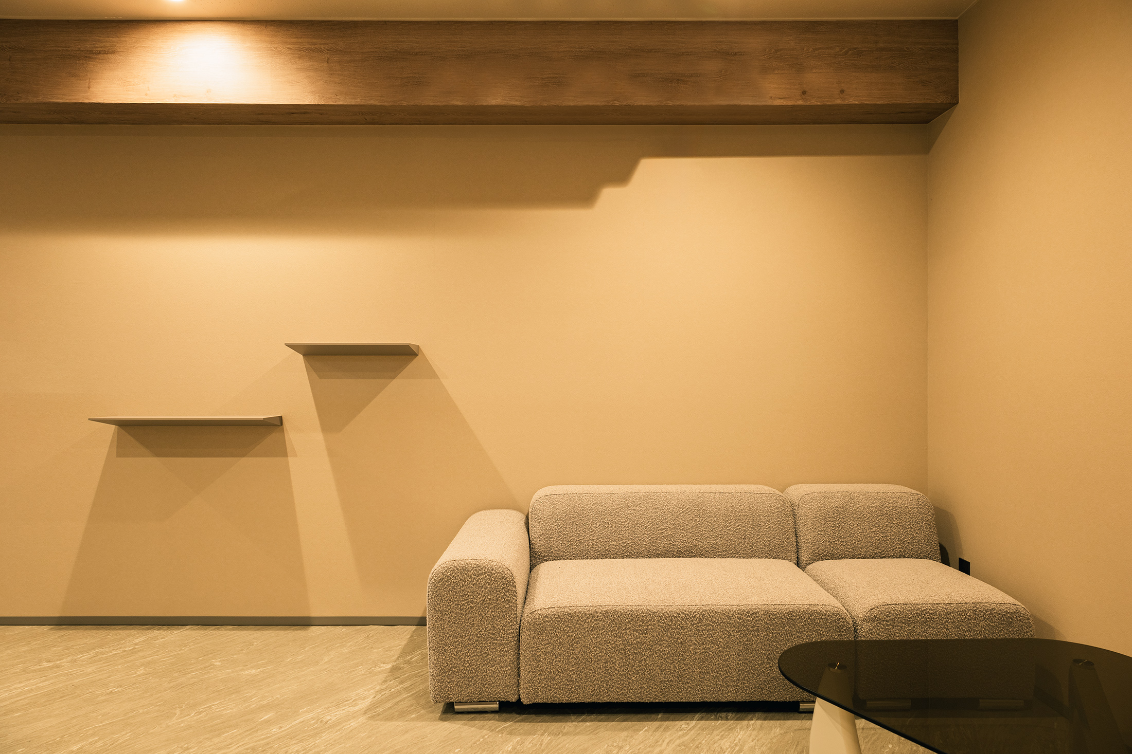 特にこだわったのは、シンメトリーな美しさを追求した施術室へのアプローチです。2つの施術室入口には優雅なアーチ開口を採用し、その縁を金色で塗装することで格調高さを演出、さらに真鍮製のブラケット照明を合わせることで上質な空間へと仕上げました。また、提供するサービスに合わせて照明設計を緻密に使い分け、フェイシャルルームにはお肌を鮮明に照らす昼白色を、ボディエステ室には深いリラックスを促す電球色の照明を選定し、それぞれの目的に応じた雰囲気を作り出しています。