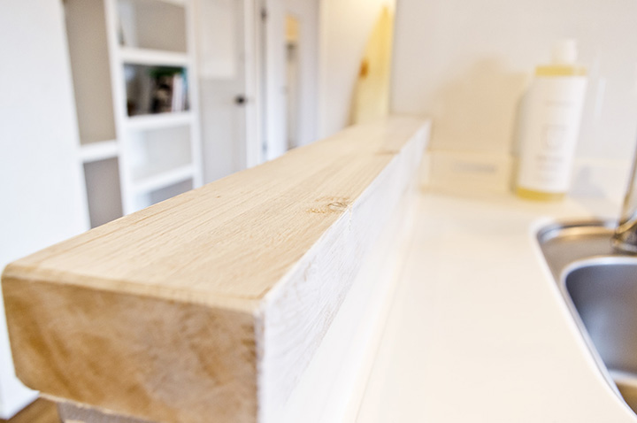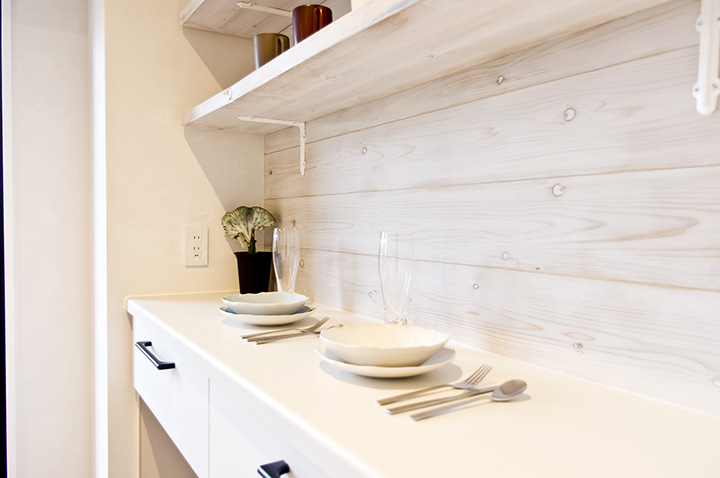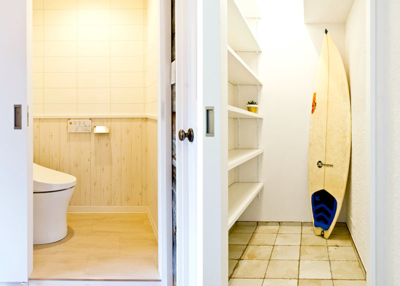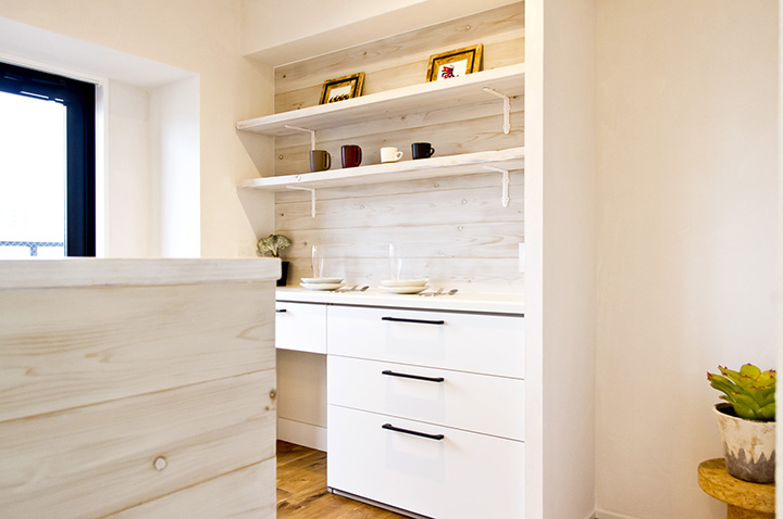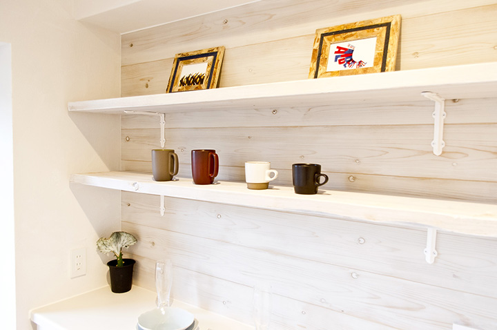 白くペイントした木材を壁に使用することで、海外の海沿いの家を彷彿とさせる、デザインに仕上げました。