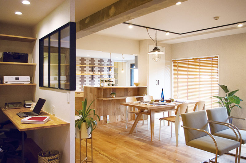 大阪市、築18年の中古マンションをフルリノベーション。お友達をたくさん招きたいというホームパーティー好きのご夫婦。和室を取り払った大空間のリビングには、テレビや本、雑貨など何でも飾れる収納棚を壁一面に設置。