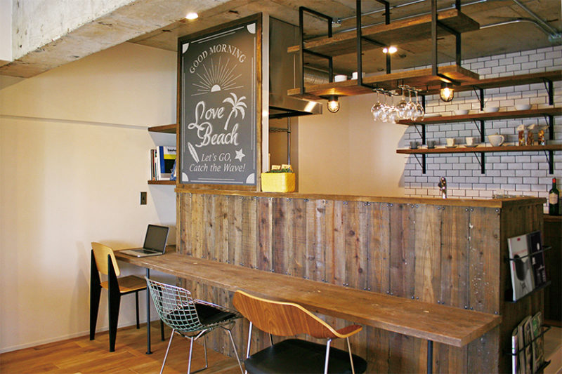 キッチンカウンターやカップポード、ダイニングテーブルやベンチ、扉など、同じ材木で揃えて製作。扉の滑車、取手、窓などに使用したアイアンが、経年の醸し出せる味わい深い空間を創出。