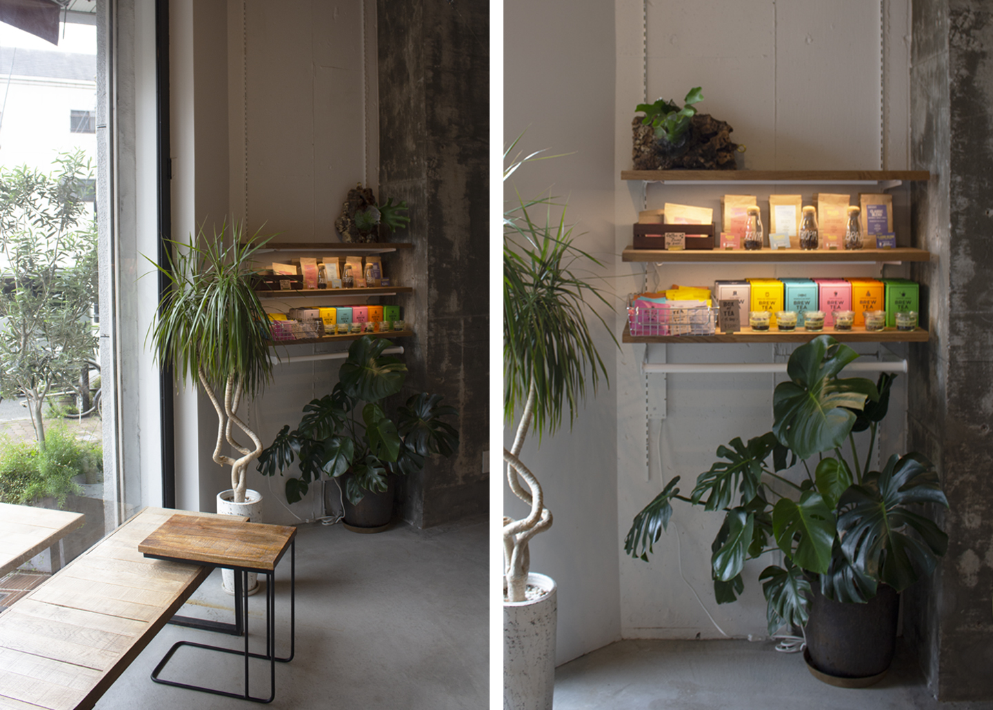 パンやコーヒー豆などの商品を陳列するガラスショーケースや、ディスプレイテーブルを設けました。