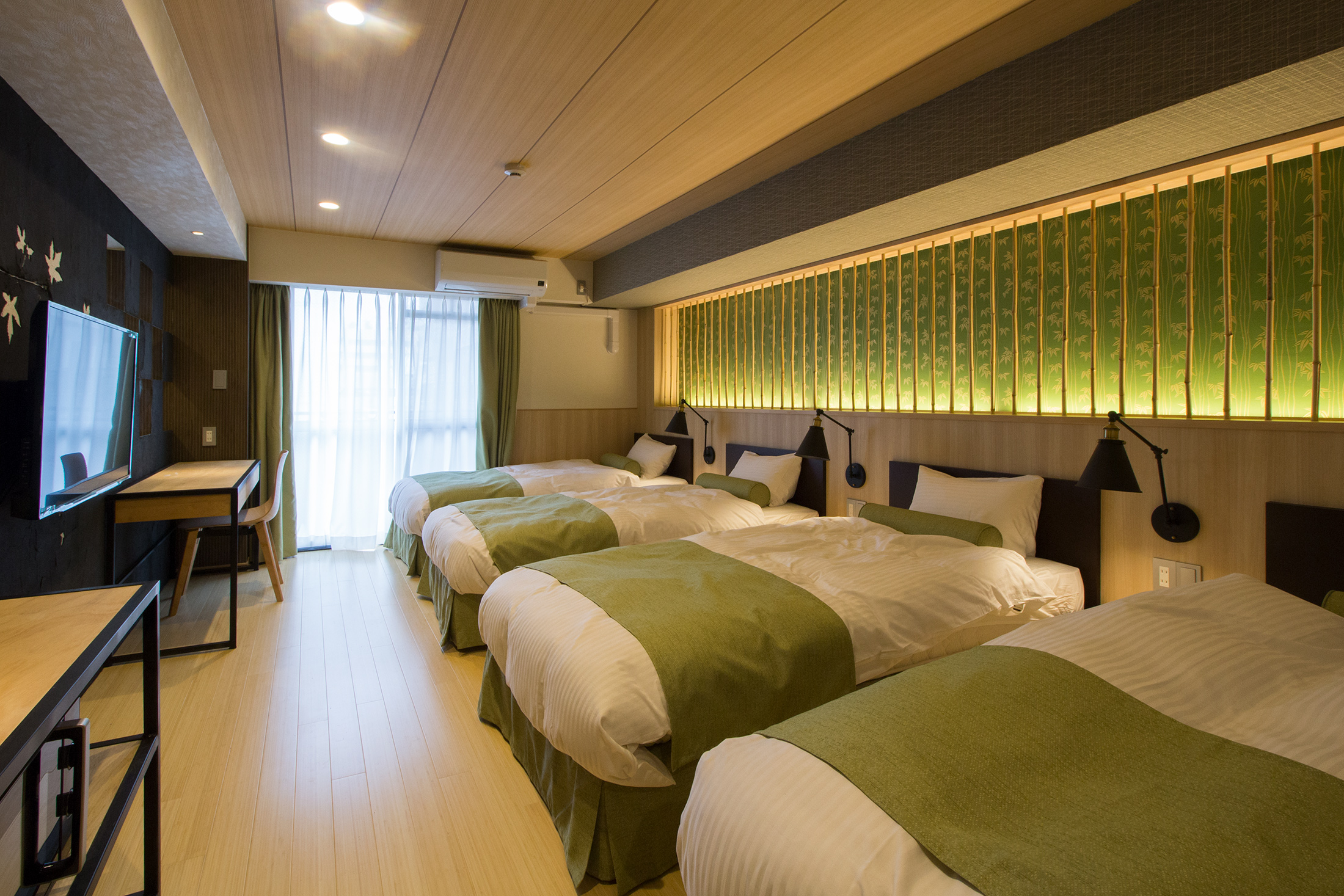 心斎橋のホテルのリノベーション。和モダンの素晴らしさを感じさせる空間に生まれ変わりました。一つ目の部屋では、竹とグリーンの壁紙が見事に組み合わさり、まるで竹林に囲まれているような落ち着きと自然の美しさを楽しめます。旅の疲れを癒やす、リラックスできる空間で都会の喧騒を忘れさせてくれます。一方、もう一つの部屋では、黒の模様の壁紙やカーペットがシックで洗練された印象に。日本画のデザインウォールがモダンな雰囲気を引き立てます。この空間は、スタイリッシュでありながらも温かみのある美しさを感じさせます。どちらの部屋も異なるコンセプトがあり、壁ごとに異なる和風の柄により細部にわたる工夫が光ります。インバウンド需要にも応えるように設計で、外国からのお客様にも日本の伝統と現代性を感じてもらえるようなデザインに。心斎橋のこのホテルでの滞在は、訪れるすべての方に特別な体験を提供する素敵な空間です。