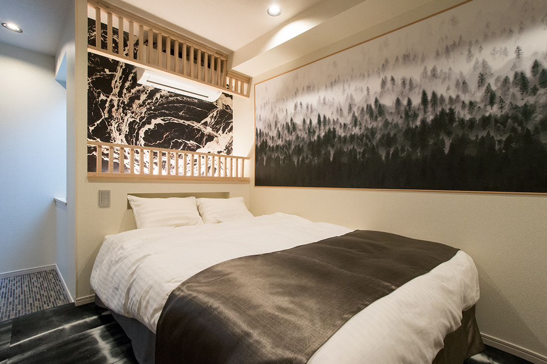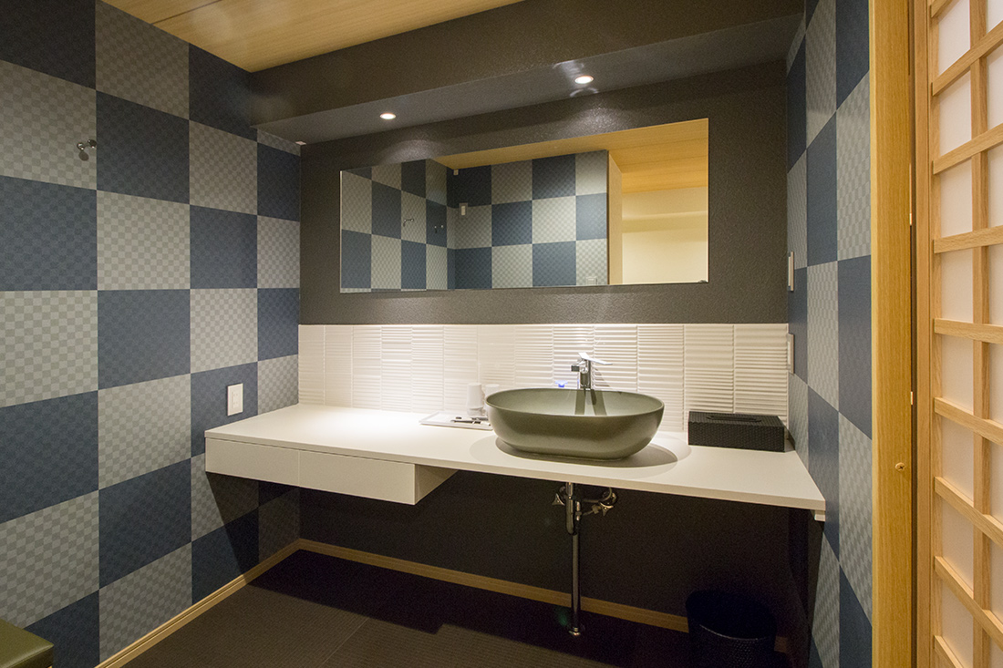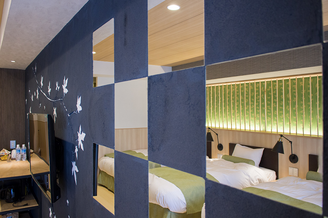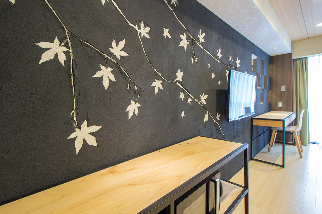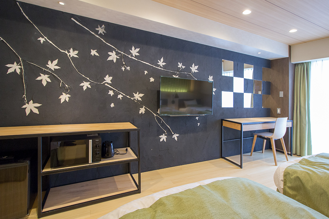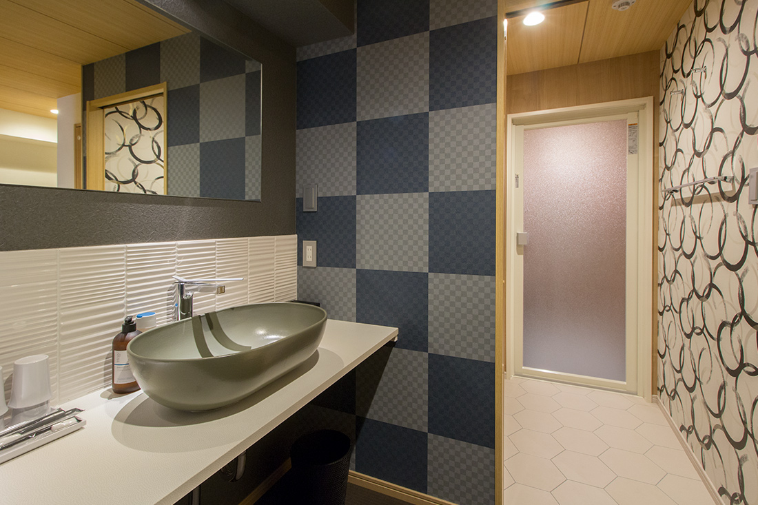 心斎橋のホテルのリノベーション。和モダンの素晴らしさを感じさせる空間に生まれ変わりました。一つ目の部屋では、竹とグリーンの壁紙が見事に組み合わさり、まるで竹林に囲まれているような落ち着きと自然の美しさを楽しめます。旅の疲れを癒やす、リラックスできる空間で都会の喧騒を忘れさせてくれます。一方、もう一つの部屋では、黒の模様の壁紙やカーペットがシックで洗練された印象に。日本画のデザインウォールがモダンな雰囲気を引き立てます。この空間は、スタイリッシュでありながらも温かみのある美しさを感じさせます。どちらの部屋も異なるコンセプトがあり、壁ごとに異なる和風の柄により細部にわたる工夫が光ります。インバウンド需要にも応えるように設計で、外国からのお客様にも日本の伝統と現代性を感じてもらえるようなデザインに。心斎橋のこのホテルでの滞在は、訪れるすべての方に特別な体験を提供する素敵な空間です。