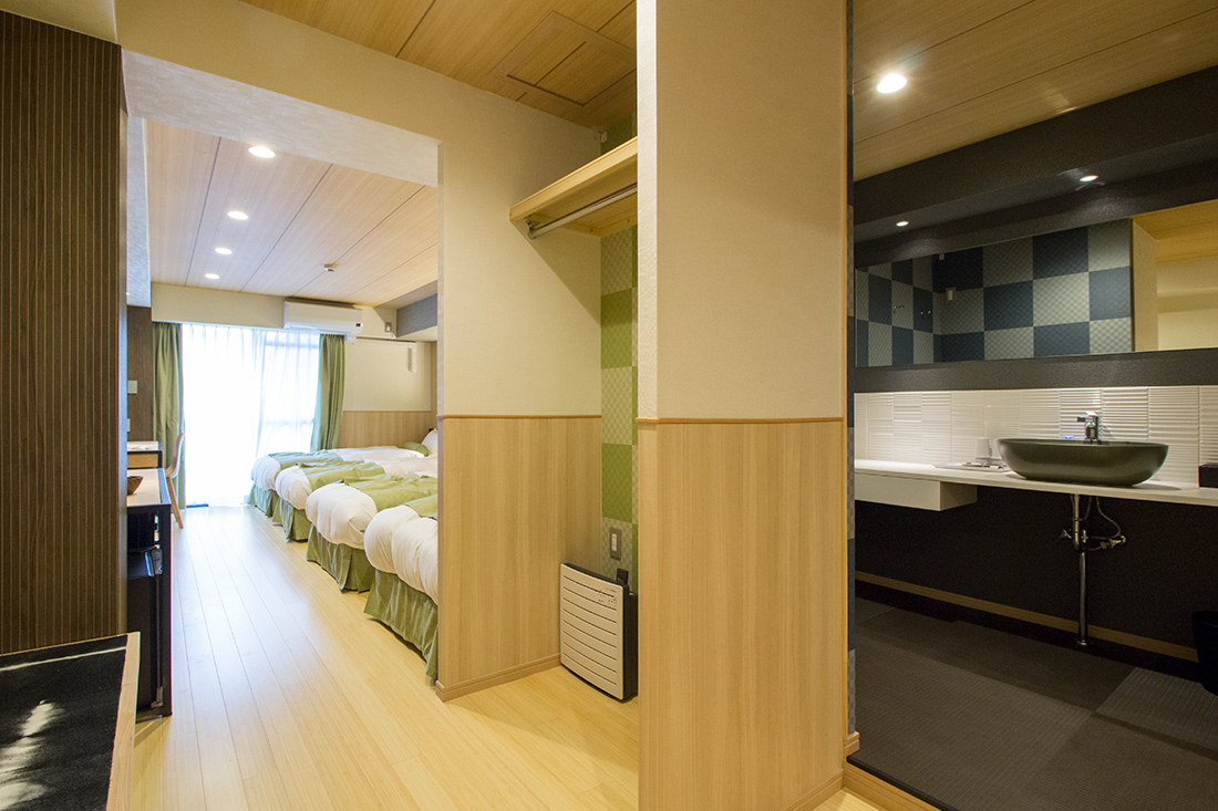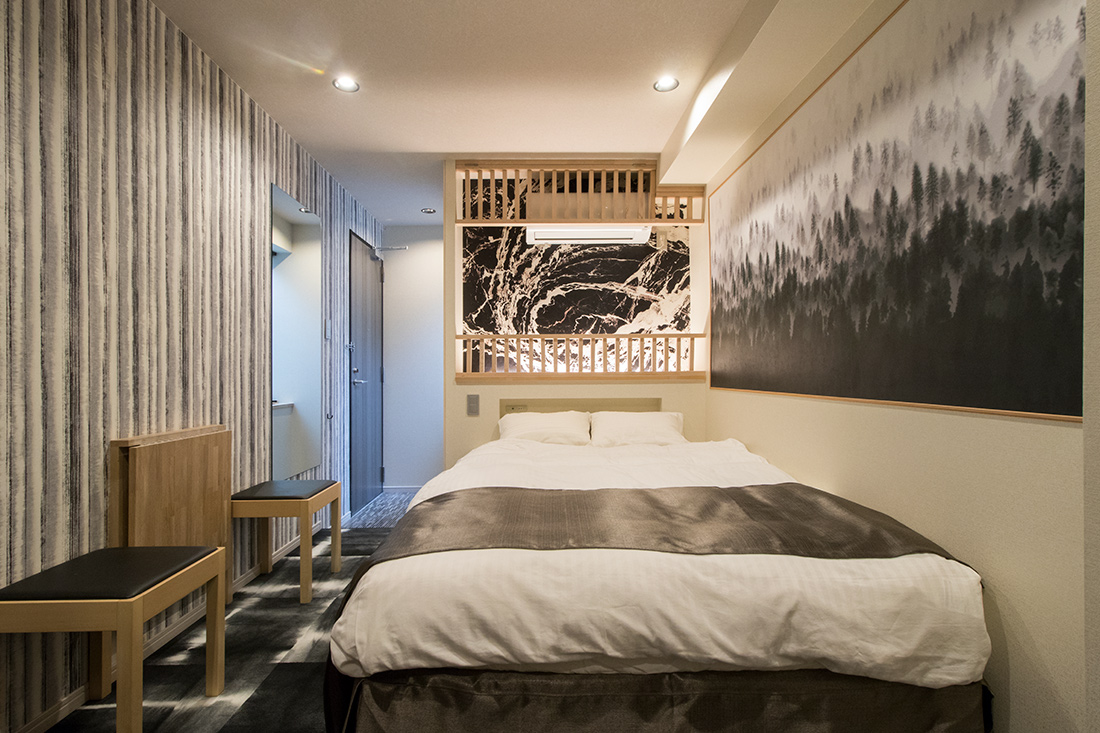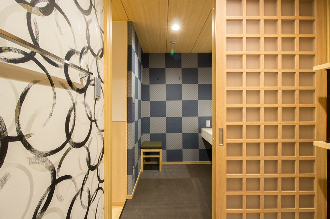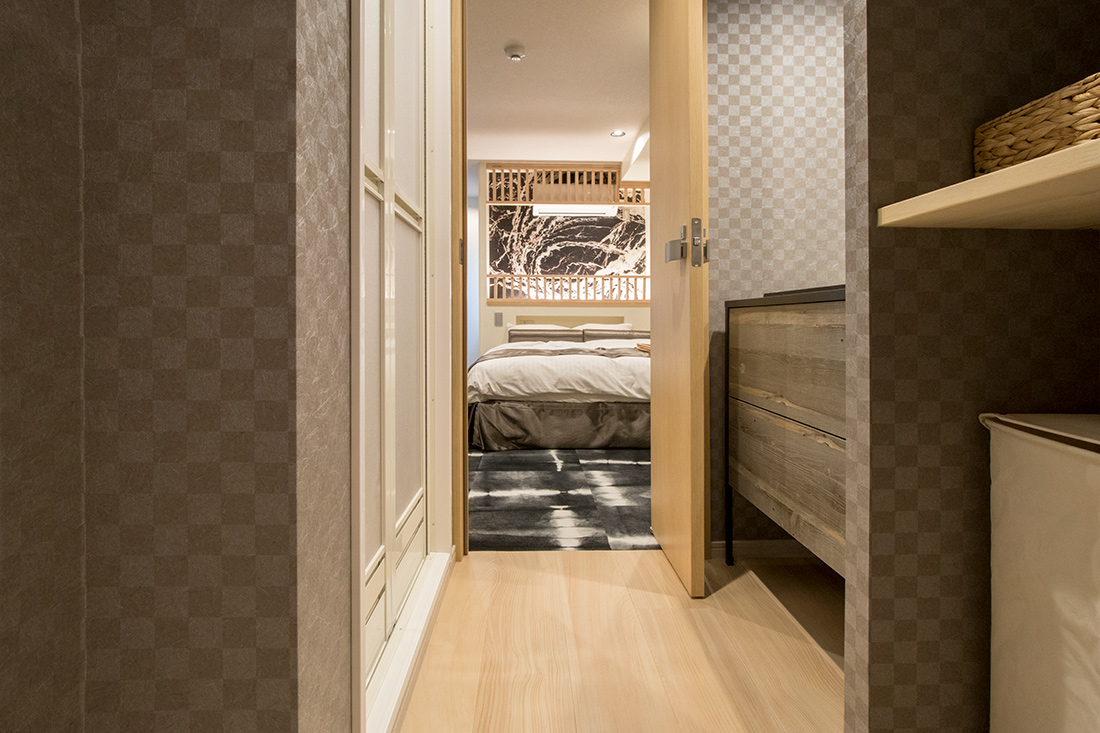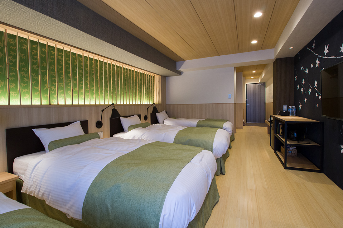心斎橋のホテルのリノベーション。和モダンの素晴らしさを感じさせる空間に生まれ変わりました。一つ目の部屋では、竹とグリーンの壁紙が見事に組み合わさり、まるで竹林に囲まれているような落ち着きと自然の美しさを楽しめます。旅の疲れを癒やす、リラックスできる空間で都会の喧騒を忘れさせてくれます。一方、もう一つの部屋では、黒の模様の壁紙やカーペットがシックで洗練された印象に。日本画のデザインウォールがモダンな雰囲気を引き立てます。この空間は、スタイリッシュでありながらも温かみのある美しさを感じさせます。どちらの部屋も異なるコンセプトがあり、壁ごとに異なる和風の柄により細部にわたる工夫が光ります。インバウンド需要にも応えるように設計で、外国からのお客様にも日本の伝統と現代性を感じてもらえるようなデザインに。心斎橋のこのホテルでの滞在は、訪れるすべての方に特別な体験を提供する素敵な空間です。