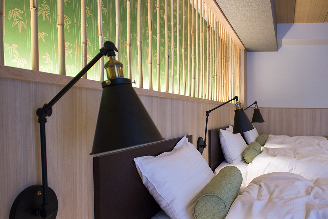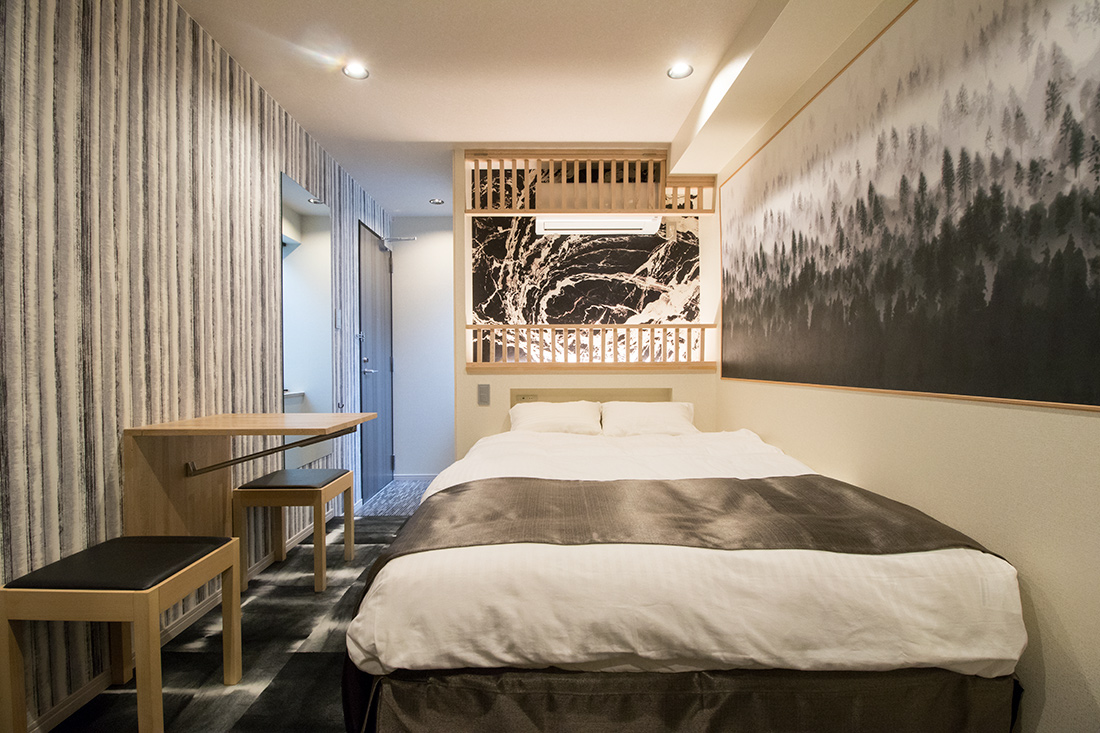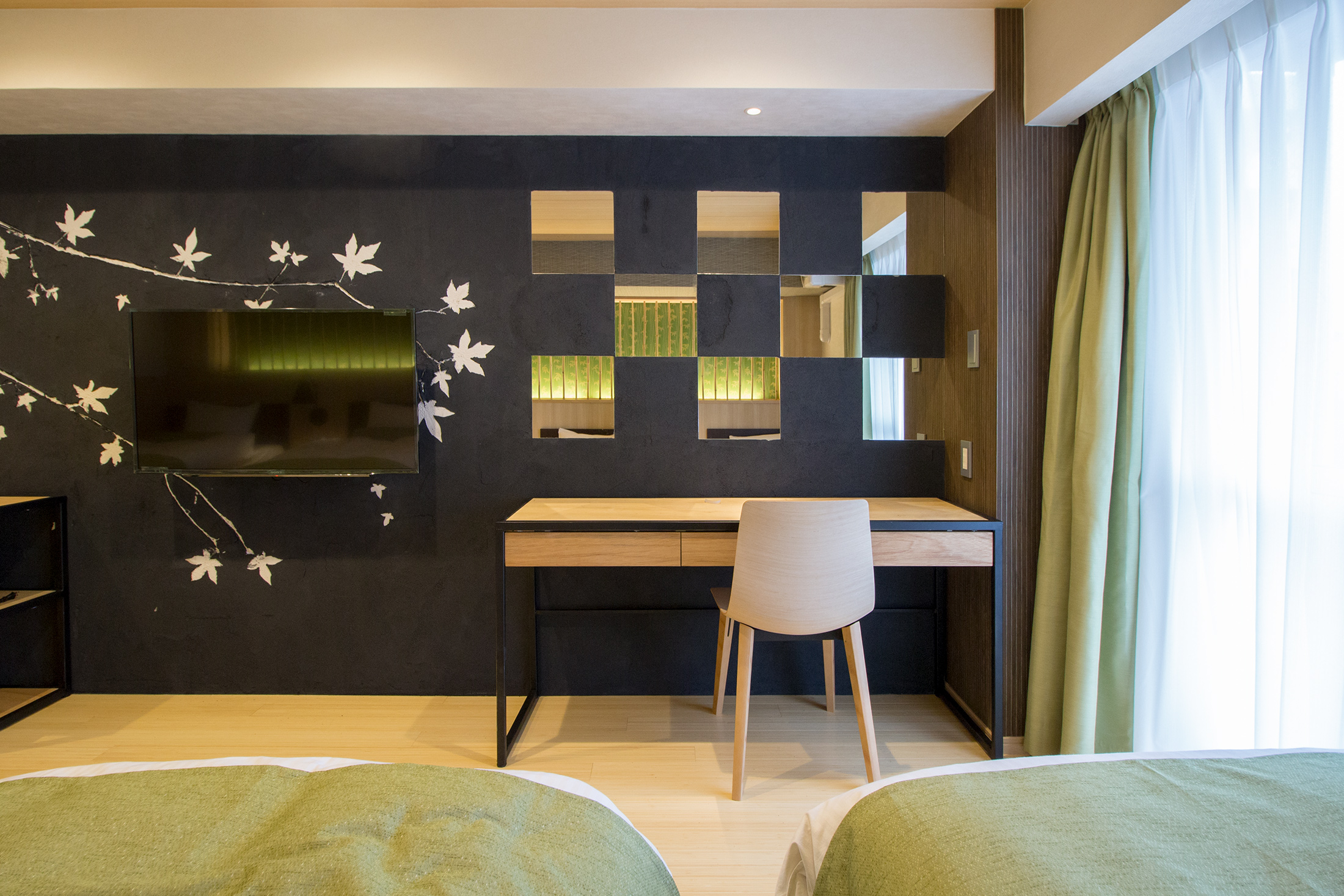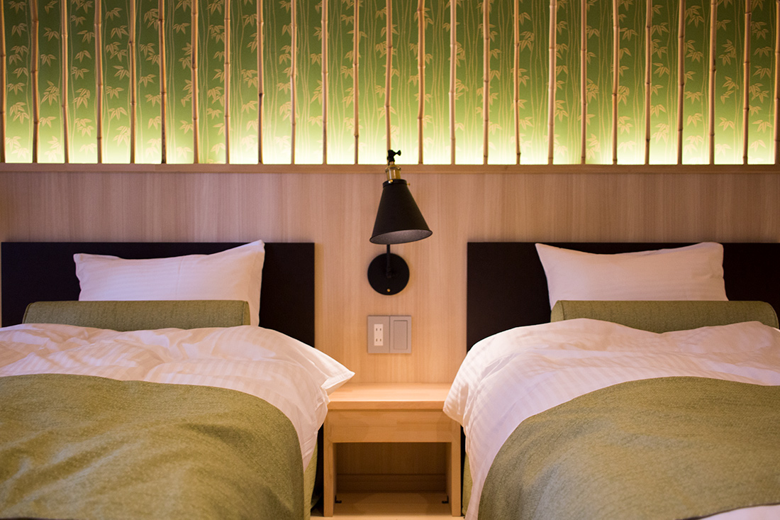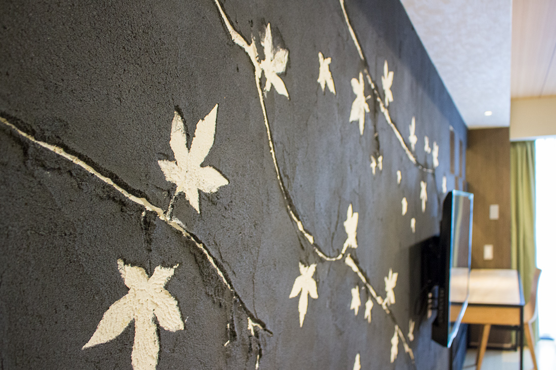 心斎橋のホテルのリノベーション。和モダンの素晴らしさを感じさせる空間に生まれ変わりました。一つ目の部屋では、竹とグリーンの壁紙が見事に組み合わさり、まるで竹林に囲まれているような落ち着きと自然の美しさを楽しめます。旅の疲れを癒やす、リラックスできる空間で都会の喧騒を忘れさせてくれます。一方、もう一つの部屋では、黒の模様の壁紙やカーペットがシックで洗練された印象に。日本画のデザインウォールがモダンな雰囲気を引き立てます。この空間は、スタイリッシュでありながらも温かみのある美しさを感じさせます。どちらの部屋も異なるコンセプトがあり、壁ごとに異なる和風の柄により細部にわたる工夫が光ります。インバウンド需要にも応えるように設計で、外国からのお客様にも日本の伝統と現代性を感じてもらえるようなデザインに。心斎橋のこのホテルでの滞在は、訪れるすべての方に特別な体験を提供する素敵な空間です。