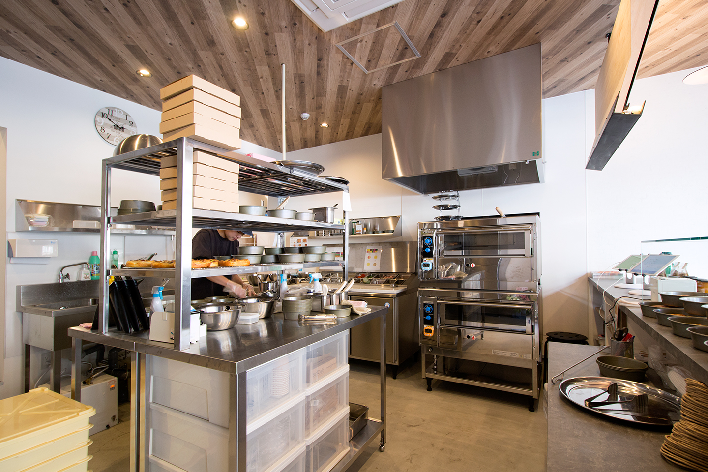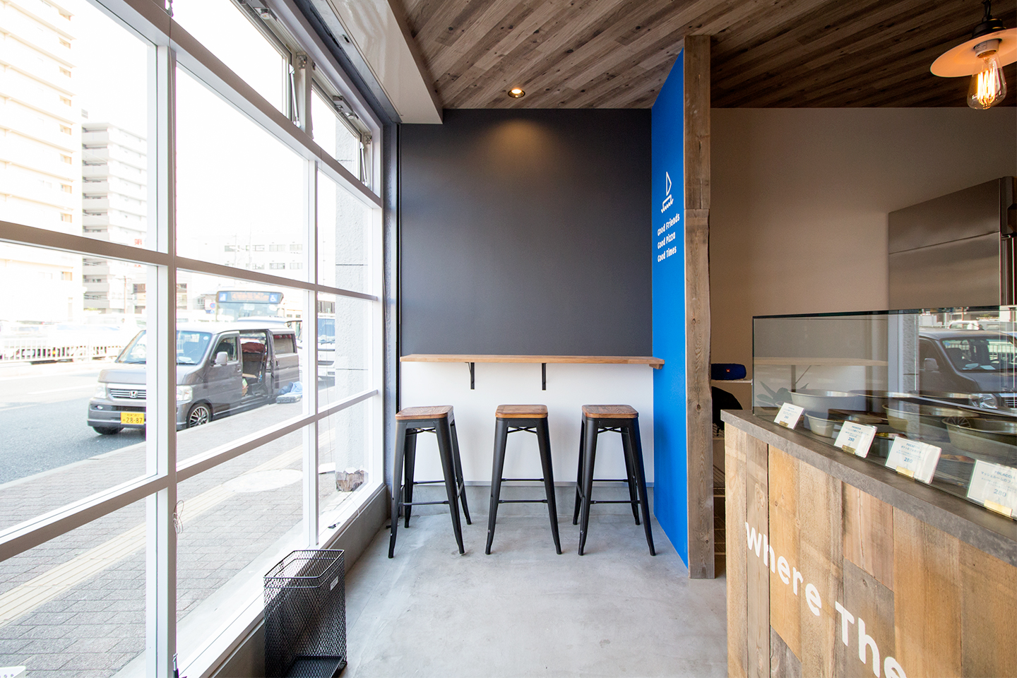 兵庫県川西市に新しくオープンしたテイクアウトピザ専門店。焼きたてのフォカッチャがパン屋さんのように並ぶガラスショーケースと、ピザを焼く工程が一目で見渡せるオープンな厨房が特徴です。ピザが作られていく過程を楽しみながら、出来立ての美味しいピザを購入できます。内装全体は、ホワイト・グレー・モルタルといった無機質なカラーリングで統一されています。これにより、クリーンでモダンな印象を与えつつも、シンプルでスタイリッシュな雰囲気を演出。店内のデザインとも見事に調和しています。レジカウンターの腰壁に使用された古材が、無機質な空間に温かみをプラスしています。古材の質感が、スタイリッシュさとともに自然な温もりをもたらし、全体的に落ち着いた雰囲気に。アクセントとして青のクロスが使われており、全体のデザインに華やかさを添えています。モダンで洗練されたスタイリッシュさに温もりをプラスした、心地よい空間です。ここで手に入るピザだけでなく、その空間自体もぜひ楽しんでください。