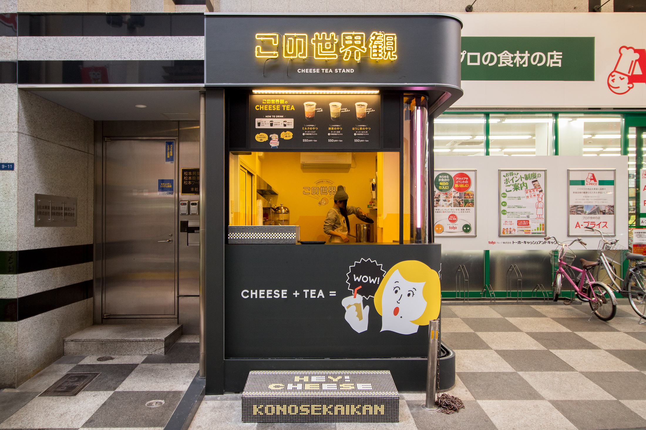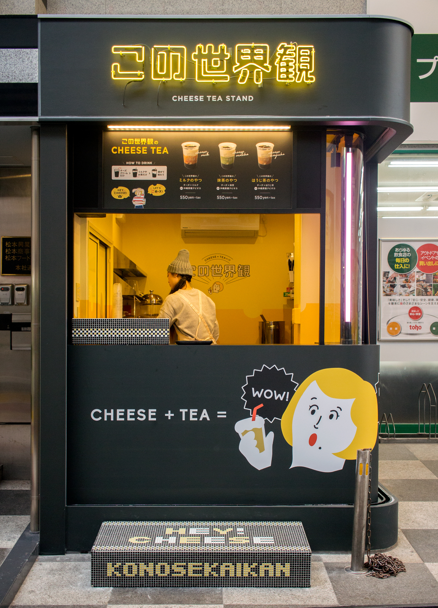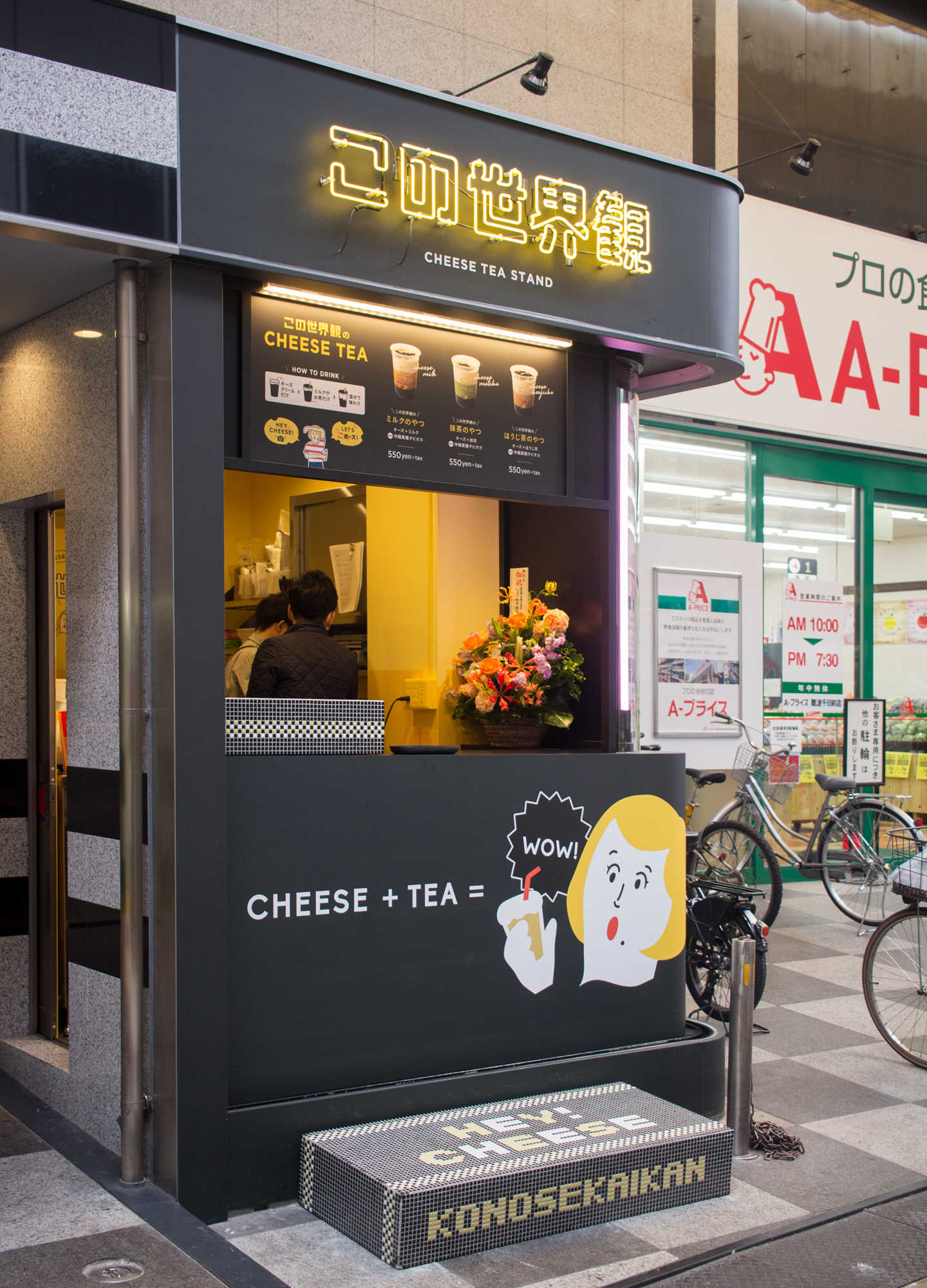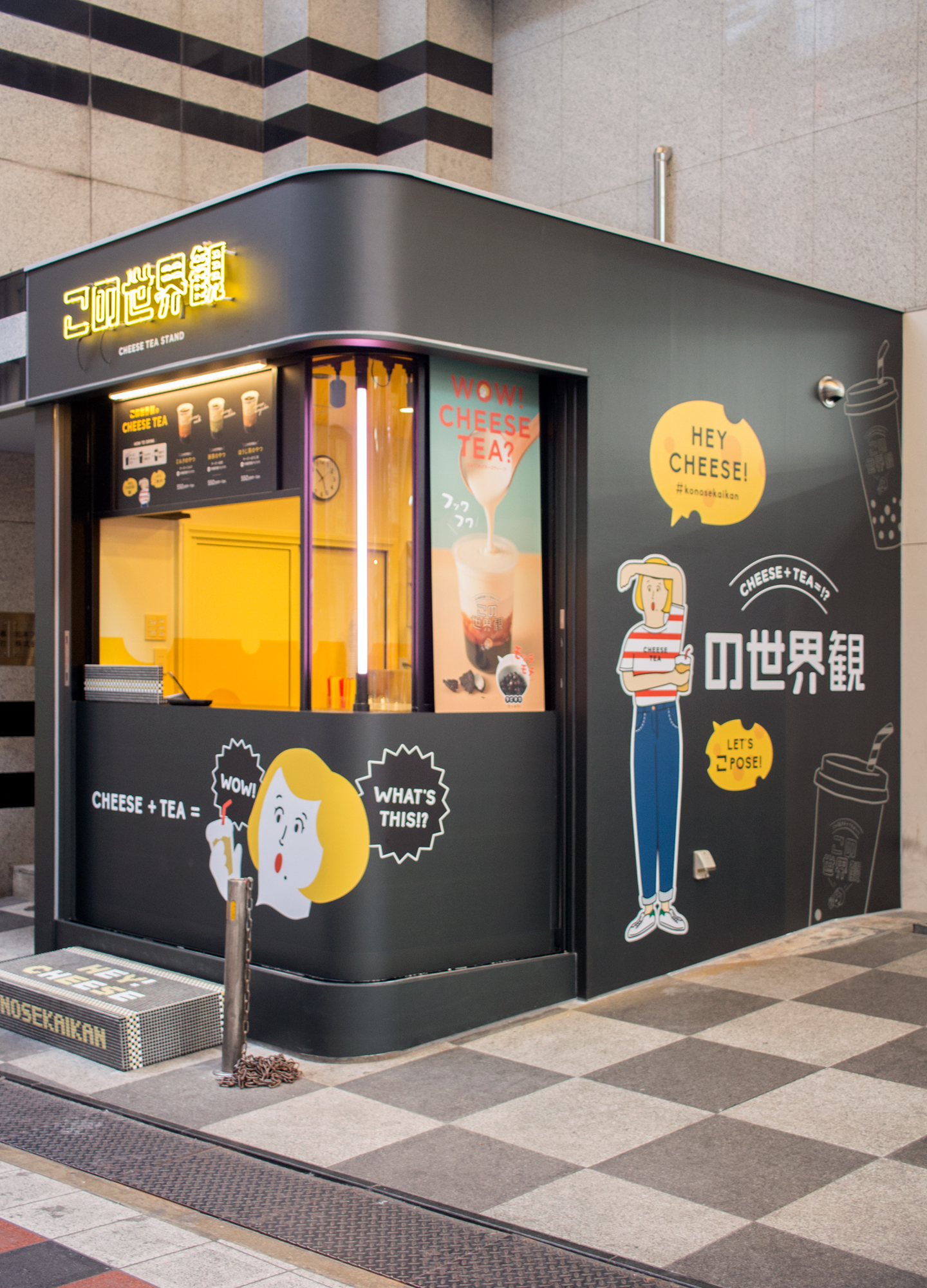 大阪市中央区にオープンしたチーズティースタンド。茶(ティー)にクリーミーなチーズフォームをトッピングした全く新しい飲み物。こちらのお店に合わせた個性的で魅力的な空間デザインをコンセプトに、リノベーションをいたしました。店内の壁には、チーズをモチーフにしたユニークなクロスを採用し、見る人に楽しい印象を与えています。外壁はシックな黒で統一し、その上にカラフルなイラストやネオンを配置。多くの店舗が並ぶ商店街の中でも目立つ存在となりました。また、ロゴやメニュー、ユニフォームのデザインに続くまで、一貫してお手伝いさせていただきました。このトータルデザインにより、店舗全体に統一感と個性が生まれ、訪れるお客様に強い印象を残すことができた結果、個性的でインパクトのある空間が実現しました。