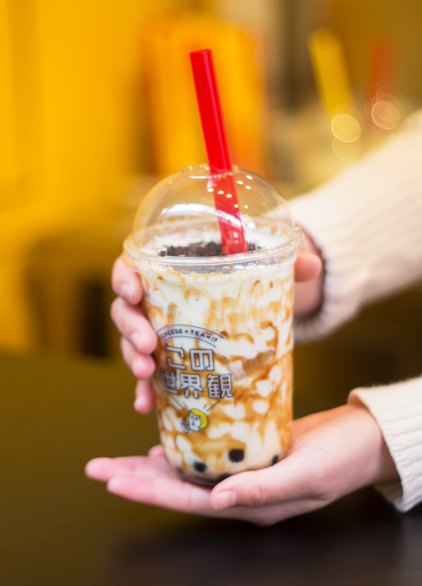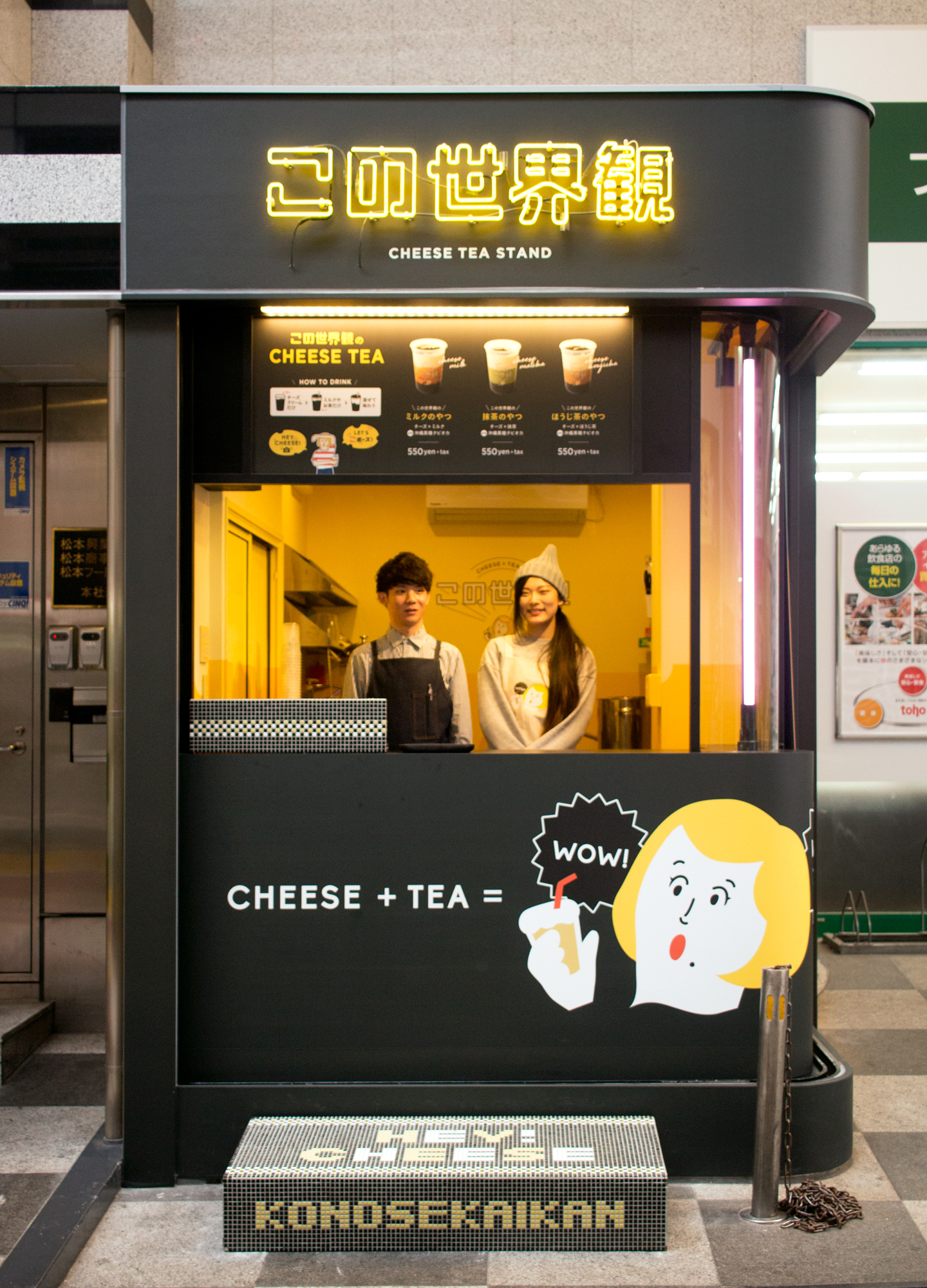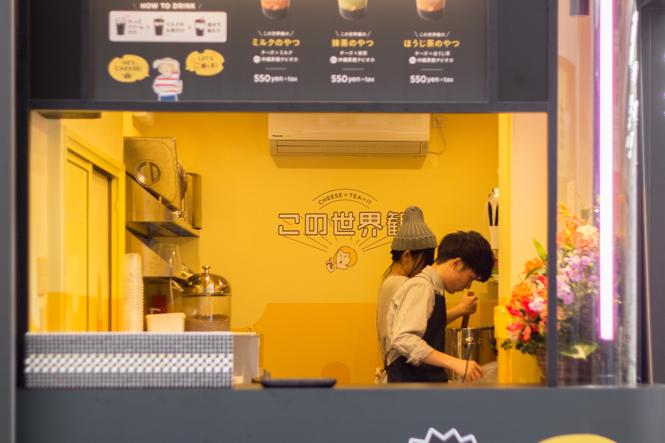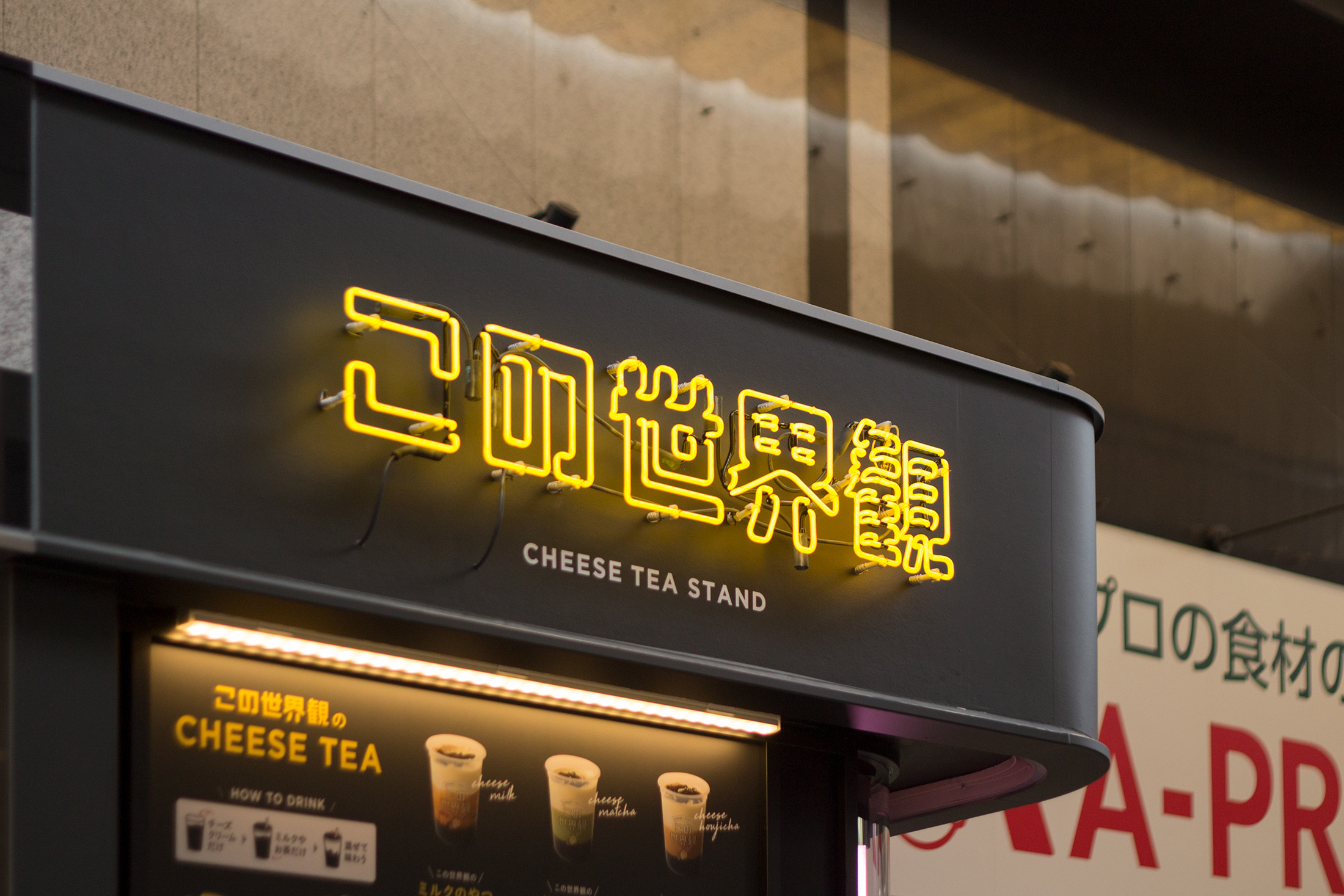 大阪市中央区にオープンしたチーズティースタンド。茶(ティー)にクリーミーなチーズフォームをトッピングした全く新しい飲み物。こちらのお店に合わせた個性的で魅力的な空間デザインをコンセプトに、リノベーションをいたしました。店内の壁には、チーズをモチーフにしたユニークなクロスを採用し、見る人に楽しい印象を与えています。外壁はシックな黒で統一し、その上にカラフルなイラストやネオンを配置。多くの店舗が並ぶ商店街の中でも目立つ存在となりました。また、ロゴやメニュー、ユニフォームのデザインに続くまで、一貫してお手伝いさせていただきました。このトータルデザインにより、店舗全体に統一感と個性が生まれ、訪れるお客様に強い印象を残すことができた結果、個性的でインパクトのある空間が実現しました。