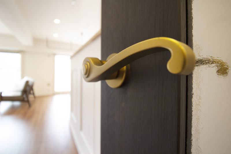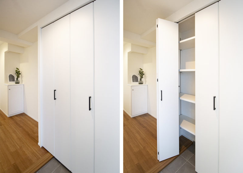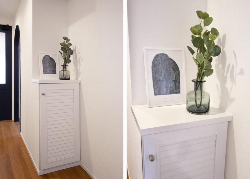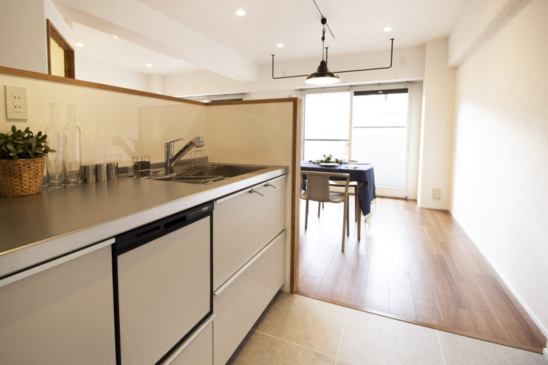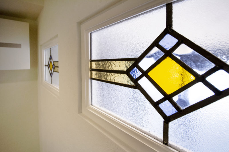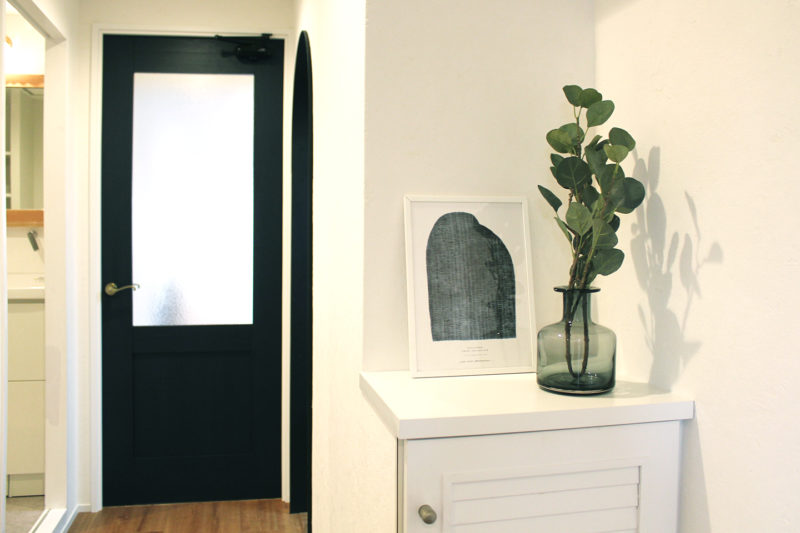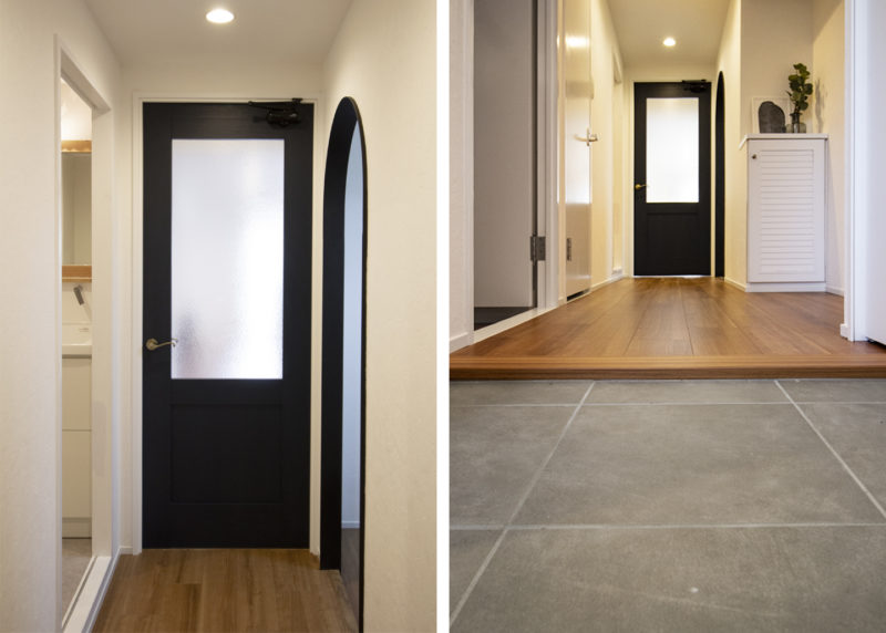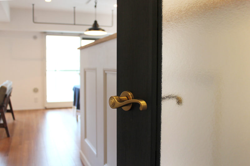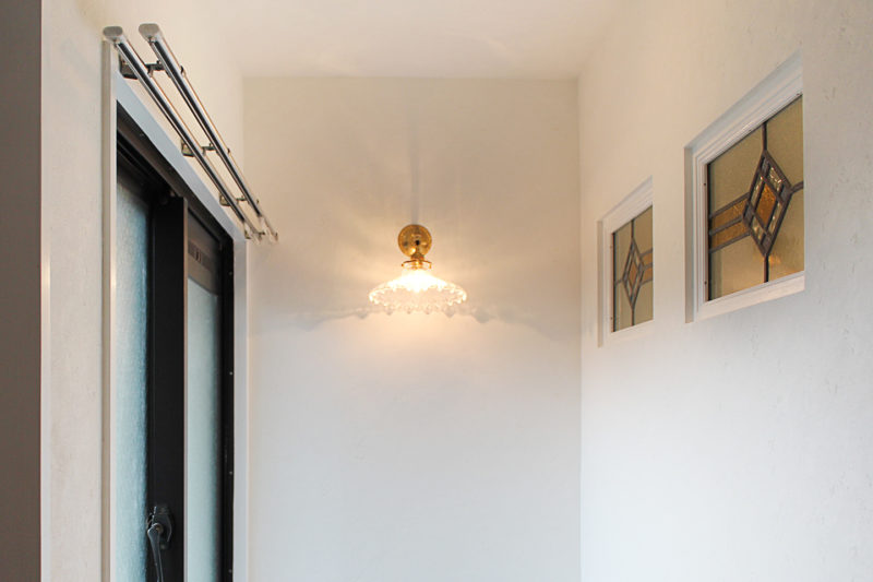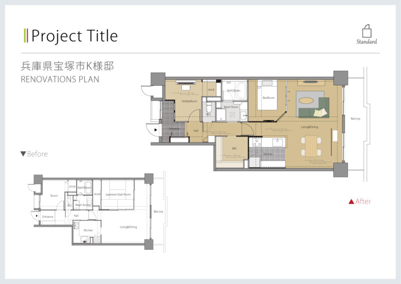 兵庫県宝塚市、築30年の中古マンションをリノベーション。物件探しからStandardで対応させて頂きました。音楽好きの施主様のご希望で、楽譜やCD用の大容量収納シェルフやピアノを配置出来るホビールームを設けました。LDKと隣接する寝室には敢えて扉を設けず、木製の室内窓を採用し、上部を風が通るようにオープンなデザインにしたことでより快適に。キッチンにはモールディングでアクセントをつけ、お料理中も居心地いい空間が視野に広がるよう、寝室の入り口を斜めにしました。広々としたエントランスには、施主様が拘ってセレクトされたアンティーク調のブラケット照明、ステンドグラスを用いてクラシカルな印象に。幻想的でステキな空間に仕上がりました。